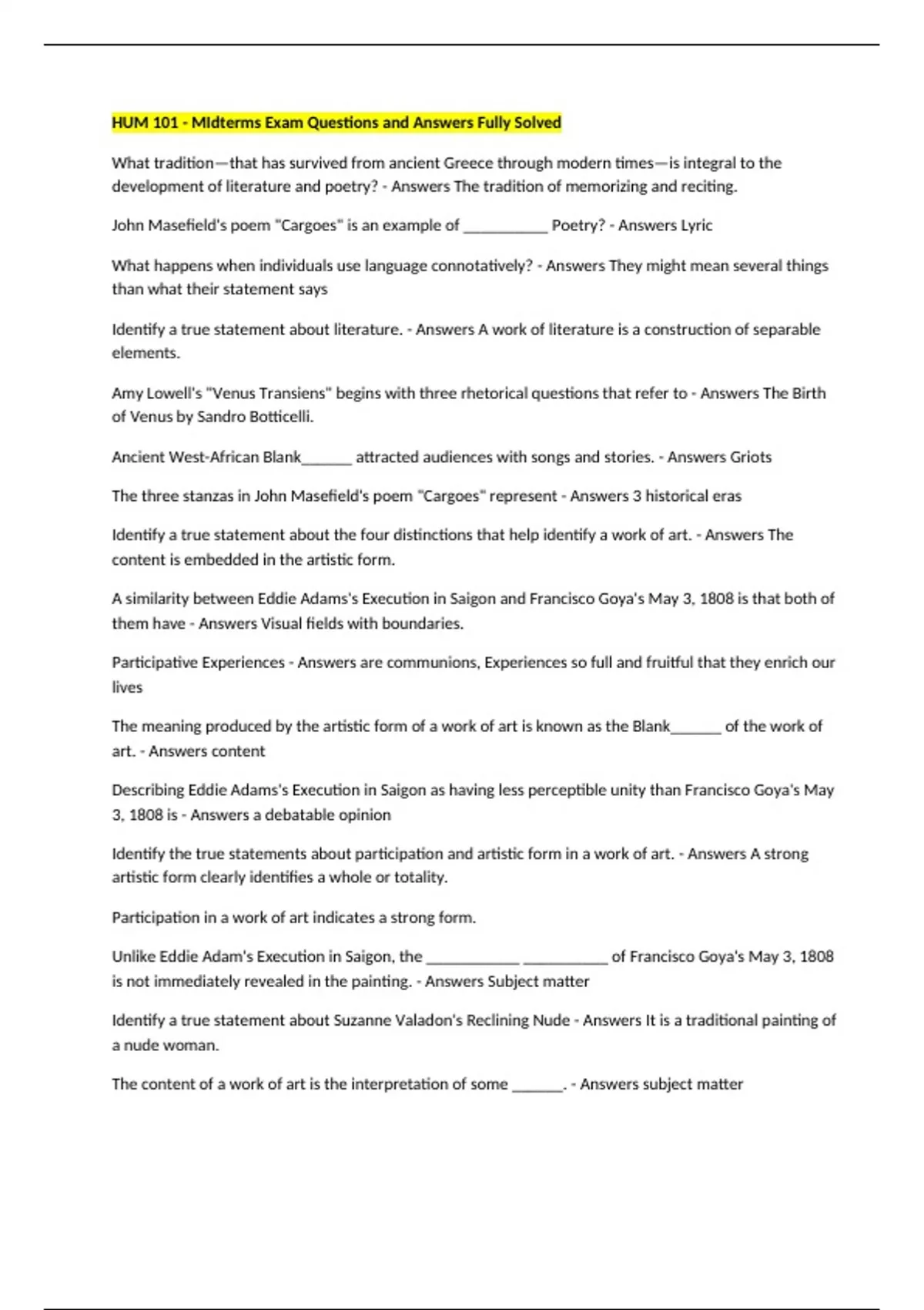 HUM 101 - MIdterms Exam Questions and Answers Fully Solved