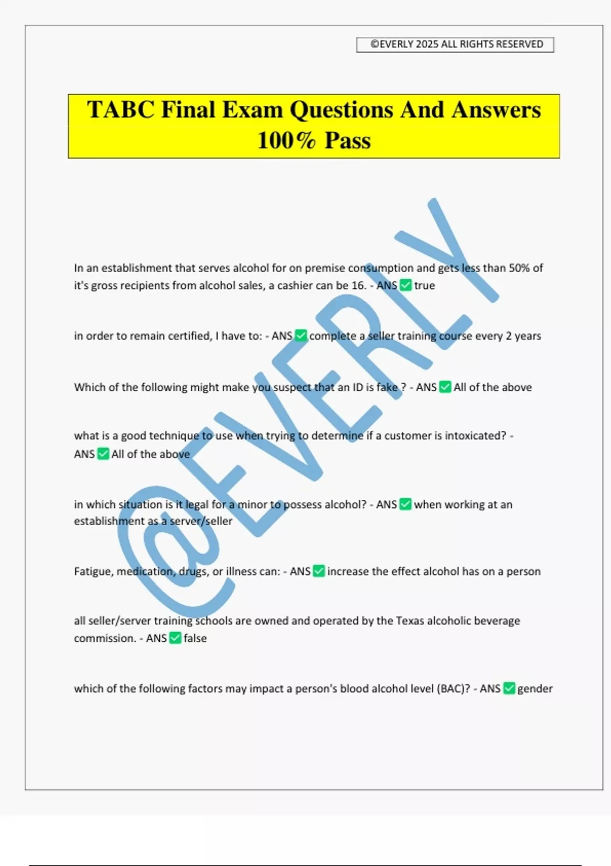 TABC Final Exam Questions And Answers 100% Pass In an establishment that serves alcohol for on premise consumption and gets less than 50% of it's gross recipients from alcohol sales, a cashier can be 16. - ANS true in order to remain certified, I have to: - ANS complete a seller training course every 2 years Which of the following might make you suspect that an ID is fake ? - ANS All of the above what is a good technique to use when trying to determine if a customer is intoxicated? - ANS All of the above in which situation is it legal for a minor to possess alcohol? - ANS when working at an establishment as a server/seller Fatigue, medication, drugs, or illness can: - ANS increase the effect alcohol has on a person all seller/server training schools are owned and operated by the Texas alcoholic beverage commission. - ANS false which of the following