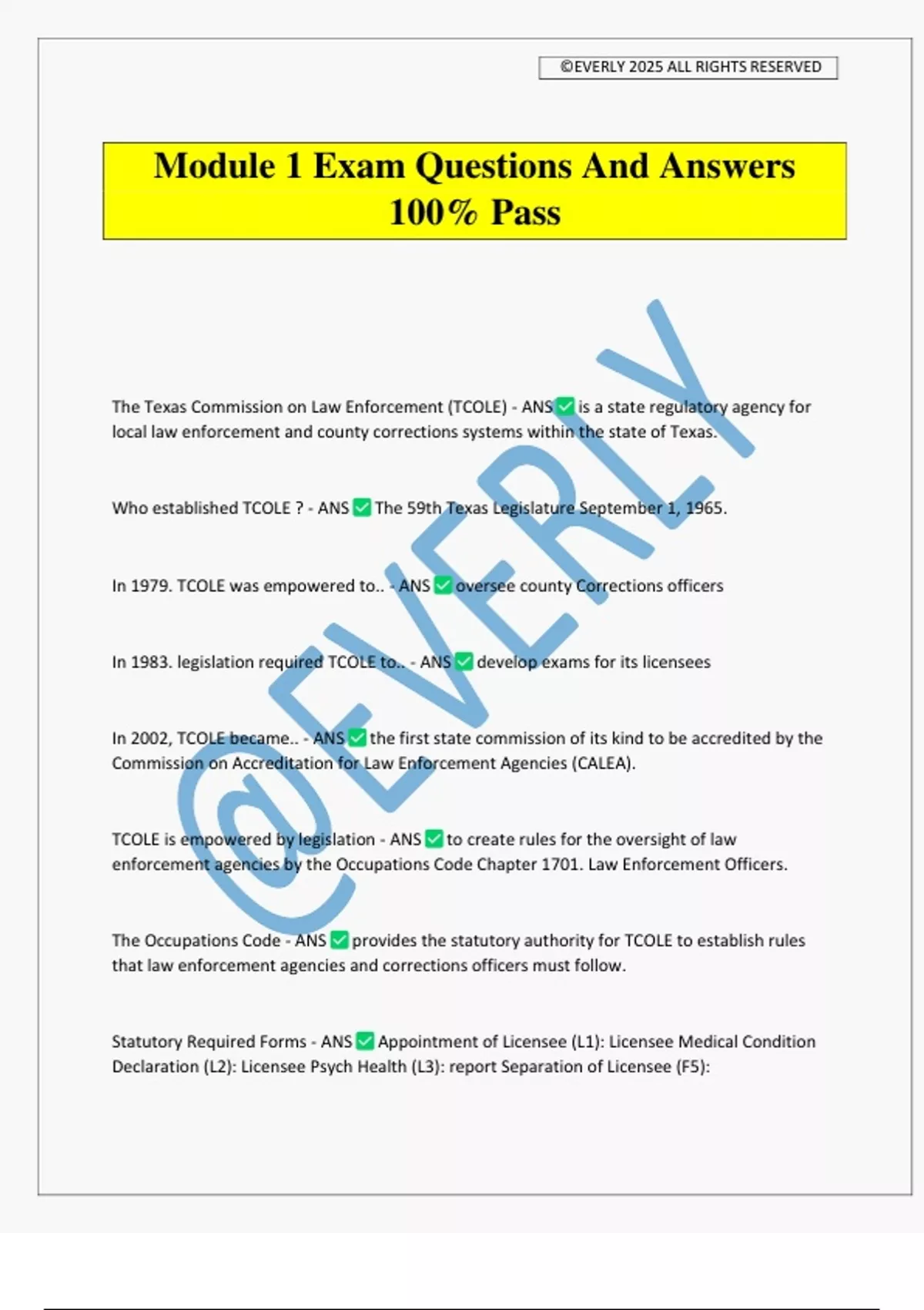 Module 1 Exam Questions And Answers 100% Pass The Texas Commission on Law Enforcement (TCOLE) - ANS is a state regulatory agency for local law enforcement and county corrections systems within the state of Texas. Who established TCOLE ? - ANS The 59th Texas Legislature September 1, 1965. In 1979. TCOLE was empowered to.. - ANS oversee county Corrections officers In 1983. legislation required TCOLE to.. - ANS develop exams for its licensees In 2002, TCOLE became.. - ANS the first state commission of its kind to be accredited by the Commission on Accreditation for Law Enforcement Agencies (CALEA). TCOLE is empowered by legislation - ANS to create rules for the oversight of law enforcement agencies by the Occupations Code Chapter 1701. Law Enforcement Officers. The Occupations Code - ANS provides the statutory authority for TCOLE to establish rules that law enforcement agencies and corrections officers must follow. Statutory Required Forms - ANS Appointment of Licensee (L1): Licensee Medical Condition Declaration (L2): Licensee Psych Health (L3): report Separation of Licensee (F5):