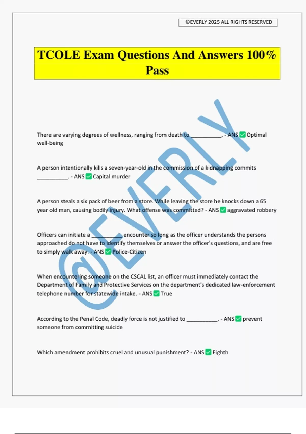 TCOLE Exam Questions And Answers 100% Pass There are varying degrees of wellness, ranging from death to __________. - ANS Optimal well-being A person intentionally kills a seven-year-old in the commission of a kidnapping commits __________. - ANS Capital murder A person steals a six pack of beer from a store. While leaving the store he knocks down a 65 year old man, causing bodily injury. What offense was committed? - ANS aggravated robbery Officers can initiate a __________ encounter so long as the officer understands the persons approached do not have to identify themselves or answer the officer's questions, and are free to simply walk away. - ANS Police-Citizen When encountering someone on the CSCAL list, an officer must immediately contact the Department of Family and Protective Services on the department's dedicated law-enforcement telephone number for statewide intake. - ANS True According to the Penal Code, deadly force is not justified to __________. - ANS prevent someone from committing suicide Which amendment prohibits cruel and unusual punishment? - ANS Eighth ©EVERLY 2025 ALL RIGHTS RESERVED According to the traffic code, an operator may not follow closer than __________ feet from a fire apparatus responding to a fire alarm or drive into or park the vehicle in the block where the fire apparatus has stopped to answer a fire alarm. - ANS 500 According to the CCP Art. 18.16, who can prevent the consequences of a theft? - ANS Anybody Prolonged unrelieved stress is called __________. - ANS Chronic Stress What Chapter of the Texas Administrative Code deals with Administration? - ANS 211 According to Sec. 43.05 of the Penal Code, if a man causes a 16-year-old girl to commit prostitution, what offense has he committed? - ANS Compelling Prostitution The __________ Amendment limits the level of force that may be used to reasonable force. - ANS Fourth The concept of the wellness lifestyle can be visualized in terms of a __________. - ANS Wellness Pyramid A person who has a mobility problem that substantially impairs the person's ability to ambulate, is the definition of __________. - ANS a disability A manual, electric, or mechanical device that alternately directs traffic to stop and to proceed is the definition of a/an __________. - ANS Traffic-control signal A victim, guardian of a victim, or close relative of a deceased victim is entitled to the following rights within the criminal justice system except the right to__________. - ANS be alone with the accused before tri