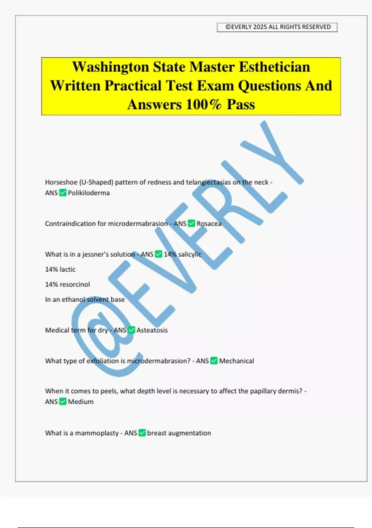 Washington State Master Esthetician Written Practical Test Exam Questions And Answers 100% Pass Horseshoe (U-Shaped) pattern of redness and telangiectasias on the neck - ANS Polikiloderma Contraindication for microdermabrasion - ANS Rosacea What is in a jessner's solution - ANS 14% salicylic 14% lactic 14% resorcinol In an ethanol solvent base Medical term for dry - ANS Asteatosis What type of exfoliation is microdermabrasion? - ANS Mechanical When it comes to peels, what depth level is necessary to affect the papillary dermis? - ANS Medium What is a mammoplasty - ANS breast augmentation ©EVERLY 2025 ALL RIGHTS RESERVED Most effective stage for hair removal - ANS Anagen Microdermabrasion crystals contain aluminum oxide, corundum and.... - ANS Salt What muscle in the forehead is both injected into? - ANS Corrugator What condition of the skin characterized by blistering or epidermal separation caused by lateral pressure of the laser? - ANS Nikol sky sign Contraindications of a body a wrap - ANS Claustrophobia Epilepsy Pregnancy Autoimmune disease What does sclerotherapy treat? - ANS Spider viens What makes cream dense? - ANS Humectants After a laser resurfacing treatment, patients will tolerate light exfoliation as early as? - ANS One month Elastosis - ANS Breakdown of elastic tissue What is the medical term for pregnacy mask? - ANS Melasma Allergic reactions are caused by... - ANS Histamines ©EVERLY 2025 ALL RIGHTS RESERVED Correct term for increased pigmentation (due to sun exposure): - ANS Chollasma What determines how many microdermabrasion passes a client can have? - ANS Thickness of the skin Causes of scabies - ANS Itch mite parasite Which gland coordinates the productions and release of hormones that travel to the pituitary gland from the base of the brain - ANS Hypothalamus Symptoms of hyperthyroidism - ANS Thinning of the skin, hair loss and weight loss What is the causes of too much hydrocortisone production - ANS Cushing's syndrome What is caused by too little hydrocortisone production - ANS Addison disease Medical term for wrinkle - ANS Rhtyid Sphingolipids and glycolingolipids are: - ANS Ceramides (intercellular cement) technical term for excessive hair growth - ANS hirsutism Where is reflexology performed? - ANS hands and feet Pathogenic bacteria - ANS Bacteria that can cause disease