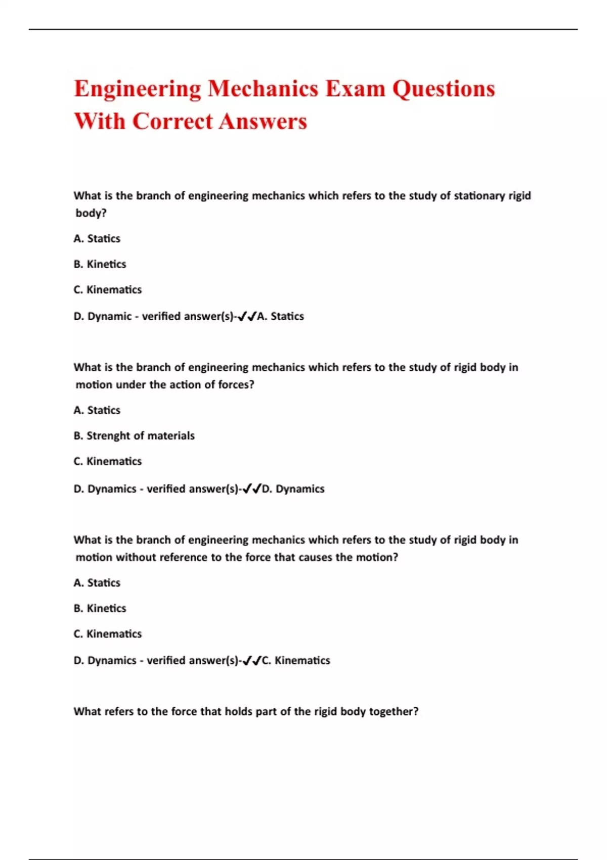 Engineering Mechanics Exam Questions With Correct Answers ,