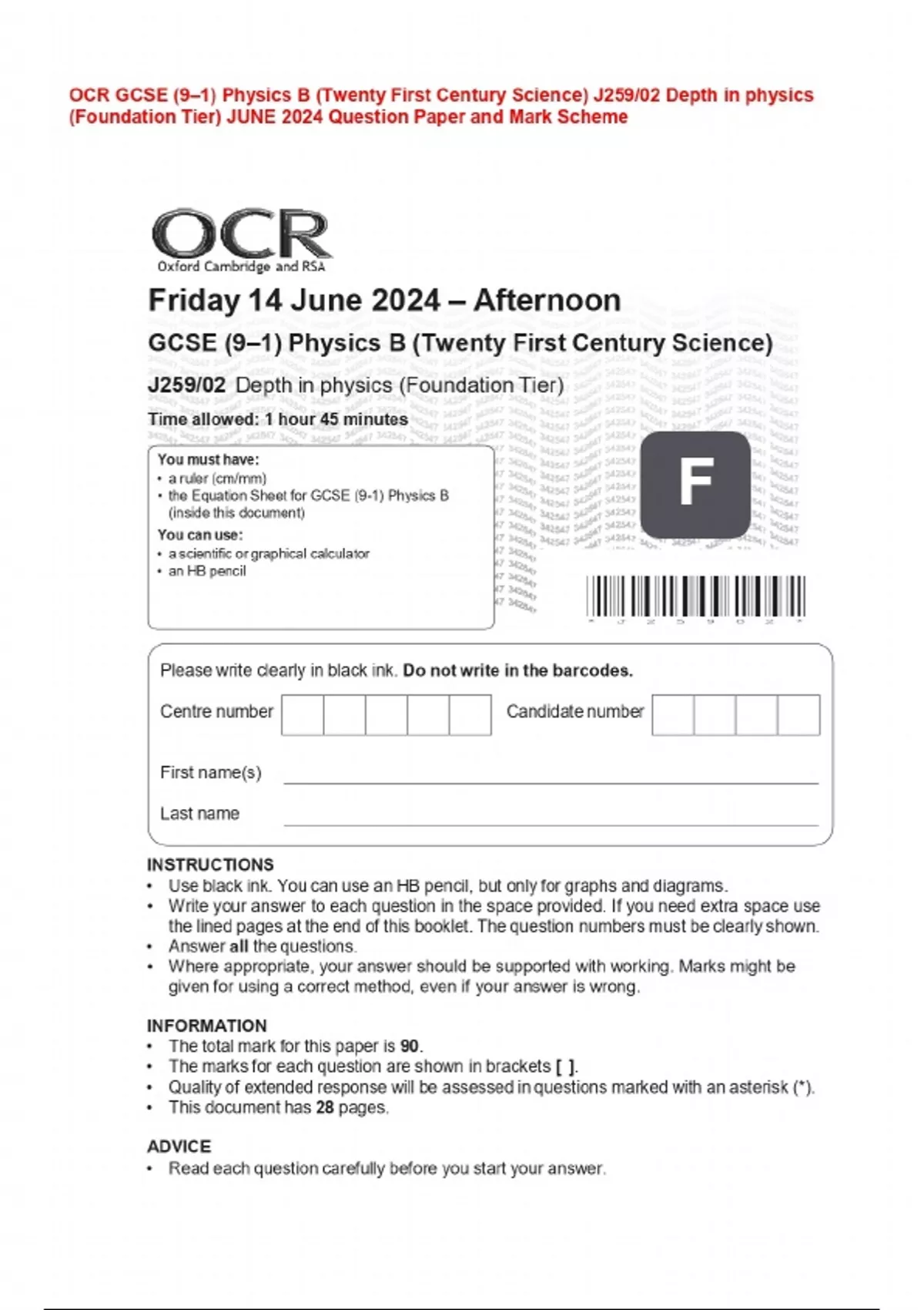 OCR GCSE (9-1) Physics 2024 Question Paper and Mark Scheme