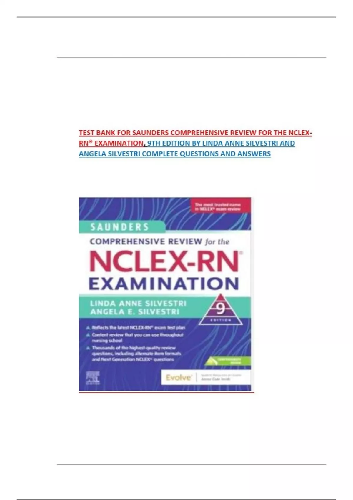 TEST BANK FOR SAUNDERS COMPREHENSIVE REVIEW FOR THE NCLEX-RN® EXAMINATION, 9TH EDITION BY LINDA ANNE SILVESTRI AND ANGELA SILVESTRI COMPLETE QUESTIONS AND ANSWERS