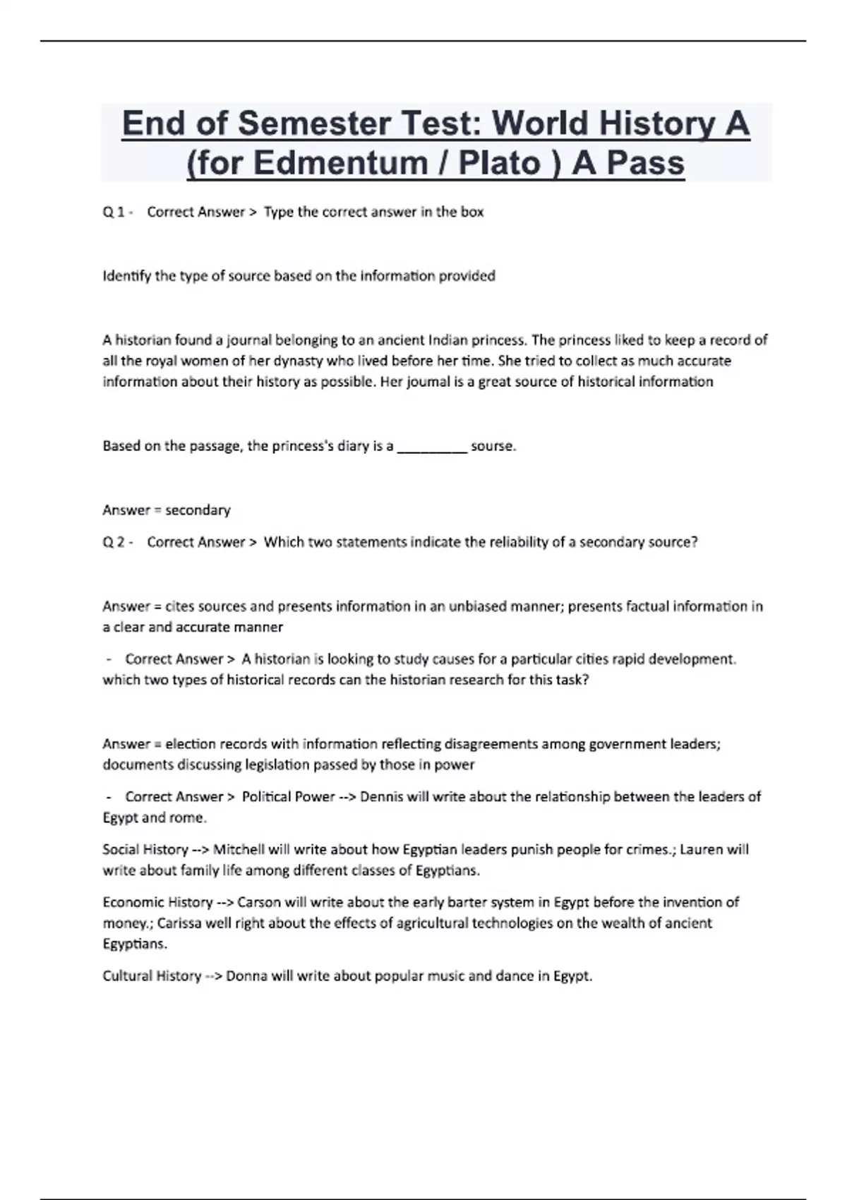 End of Semester Test World History A (for Edmentum Plato ) A Pass