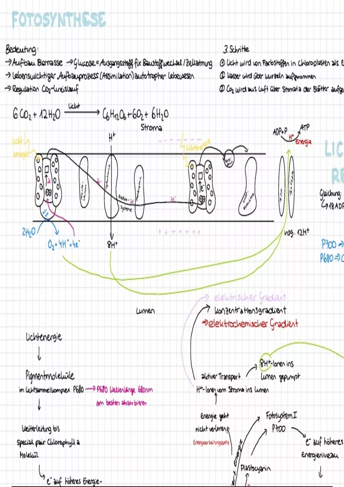 Top-Zusammenfassung zur Fotosynthese – Perfekt für Abitur & Klausuren! Diese ausführliche und dennoch übersichtliche Zusammenfassung erklärt alle Schritte der Fotosynthese – von der lichtabhängigen Reaktion in den Thylakoidmembranen bis zum Calvin-Zyklus in der lichtunabhängigen Reaktion im Stroma. Ideal für Schüler:innen der Oberstufe, insbesondere für Biologie-Leistungskurse, deckt das Dokument folgende Inhalte ab: • Struktur & Funktion der Chloroplasten • Detaillierter Ablauf der lichtabhängigen Reaktion (mit ATP-Synthese, Elektronentransportkette etc.) • Calvin-Zyklus mit allen Zwischenprodukten und Enzymen (z. B. Rubisco) • Wichtige Reaktionsgleichungen und Fachbegriffe • Unterschiede & Gemeinsamkeiten von lichtabhängiger und lichtunabhängiger Phase • Visuelle Gliederung mit klarer Struktur und logischem Aufbau Bonus: Enthält auch Einflussfaktoren & Schlüsselbegriffe für Prüfungen! Empfohlen für das Zentralabitur, Klausuren und mündliche Prüfungen.