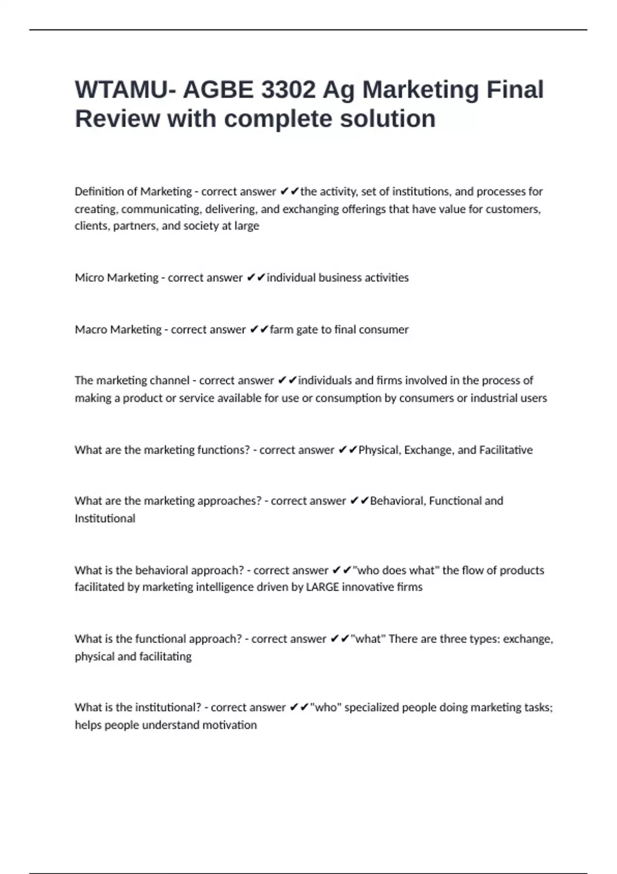 Definition of Marketing - correct answer ✔✔the activity, set of institutions, and processes for