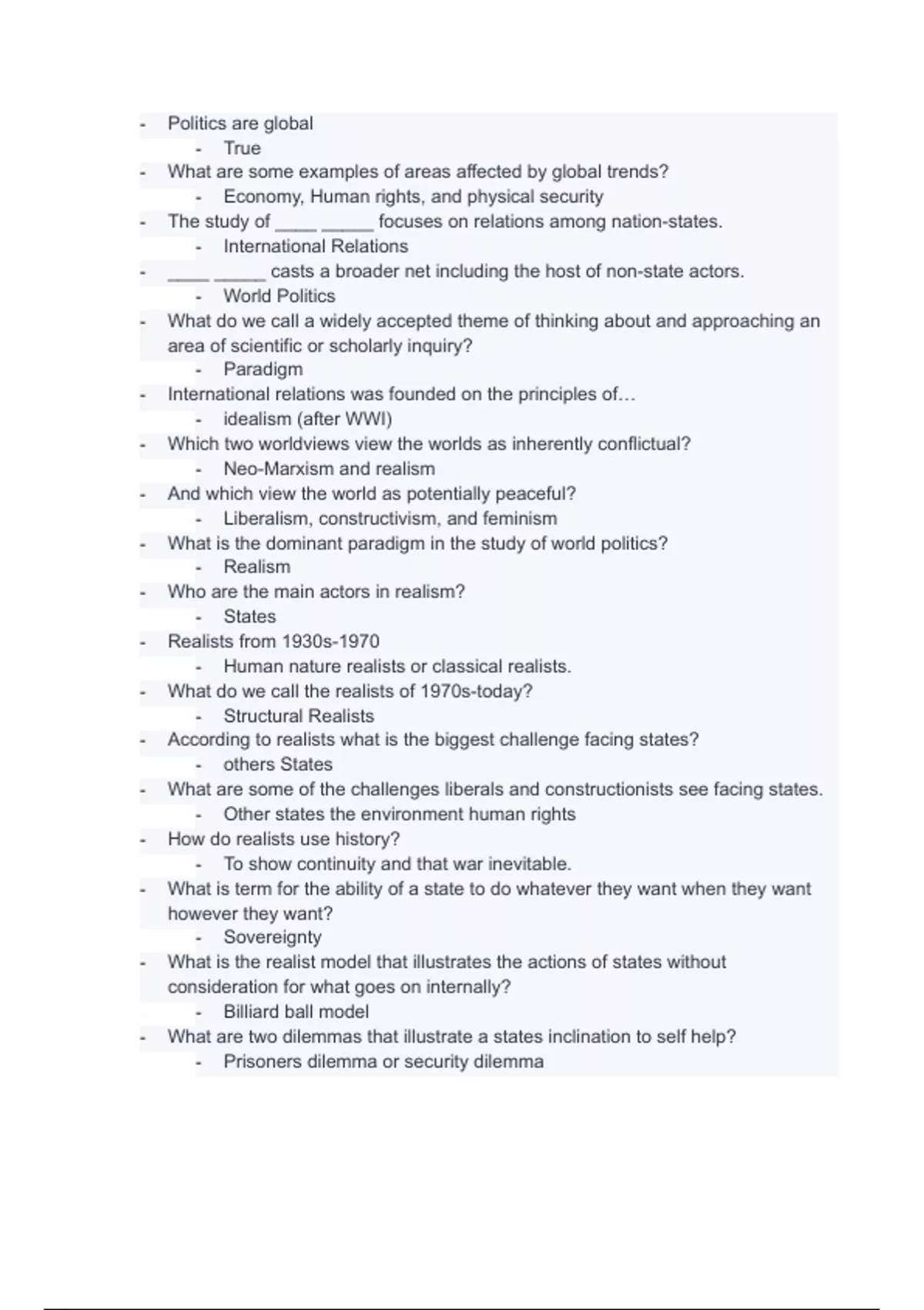 This study guide provides an overview of key concepts in international relations and world politics. It outlines major paradigms—such as realism, liberalism, constructivism, and neo-Marxism—and their views on conflict, cooperation, and the nature of global actors. It also covers historical milestones and events like the World Wars, the Cold War, and 9/11 that shaped international systems. Additionally, it examines different types of wars, theories of justice in warfare, and nuclear strategy. Finally, it discusses influential thinkers like Fukuyama and Huntington, who offered contrasting visions of global order and conflict.