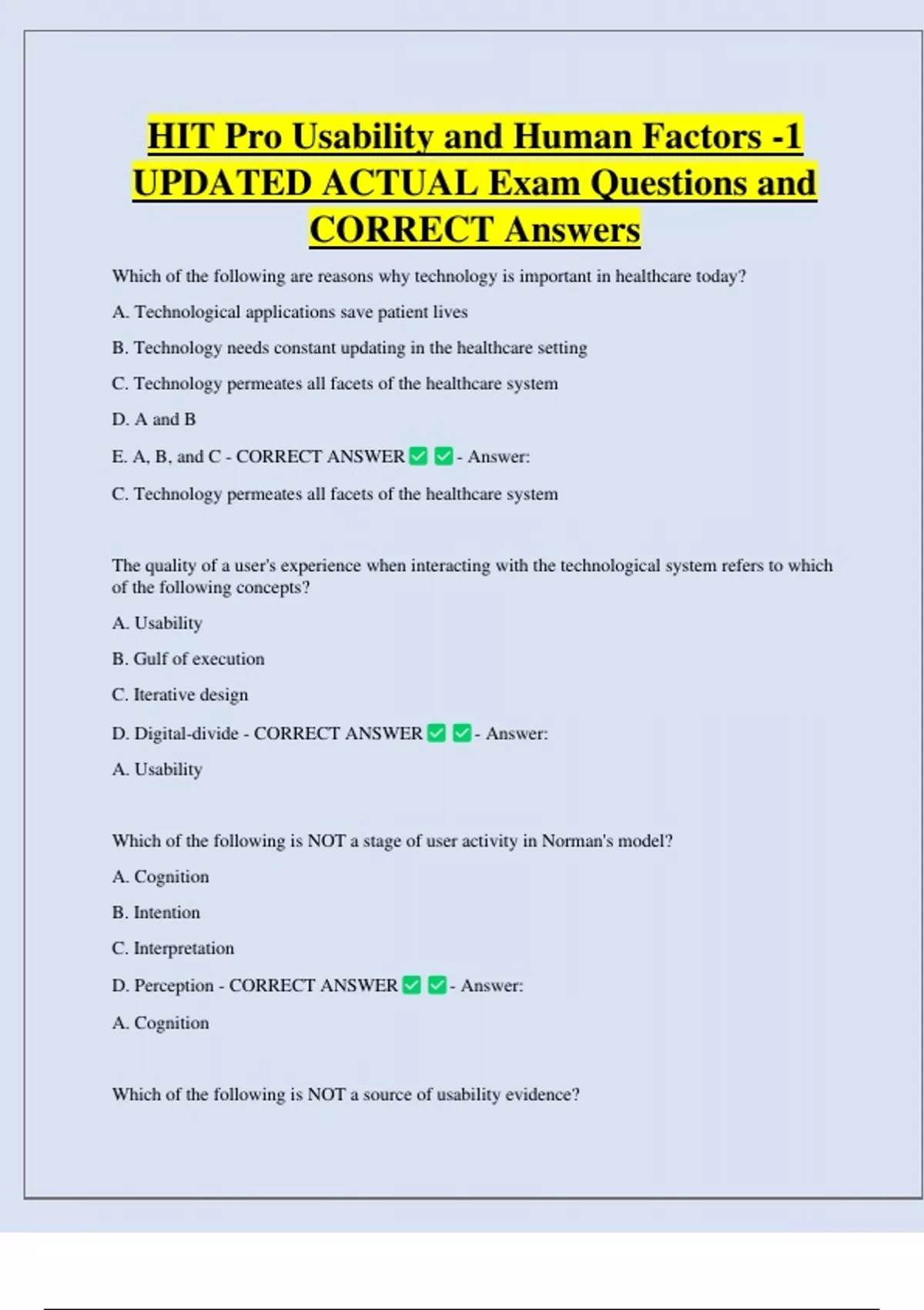 HIT Pro Usability and Human Factors -1 UPDATED ACTUAL Exam Questions and CORRECT Answers Which of the following are reasons why technology is important in healthcare today? A. Technological applications save patient lives B. Technology needs constant updating in the healthcare setting C. Technology permeates all facets of the healthcare system D. A and B E. A, B, and C - CORRECT ANSWER - Answer: C. Technology permeates all facets of the healthcare system The quality of a user's experience when interacting with the technological system refers to whic