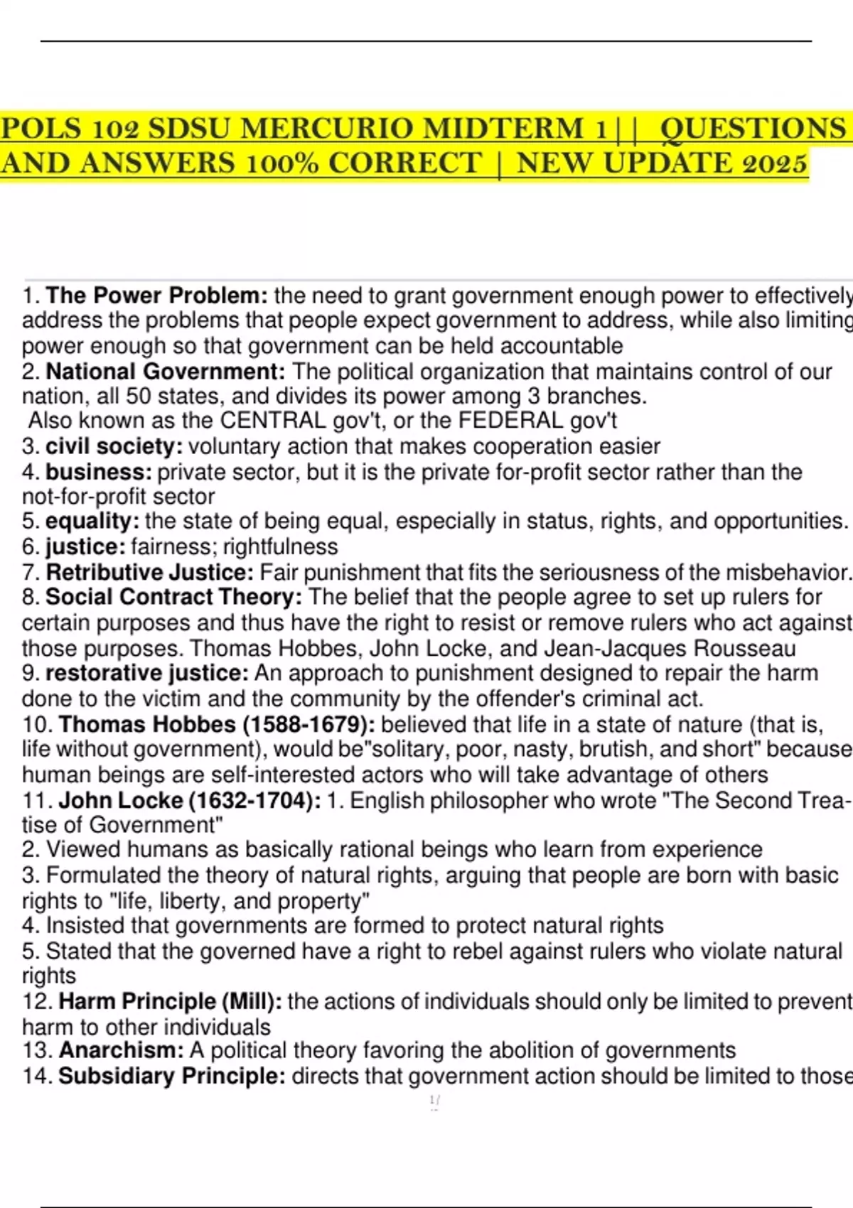 POLS 102 SDSU MERCURIO MIDTERM 1|| QUESTIONS AND ANSWERS 100% CORRECT | NEW UPDATE 2025 1. The Power Problem: the need to grant government enough power to effectively address the problems that people expect government to address, while also limiting power enough so that government can be held accountable