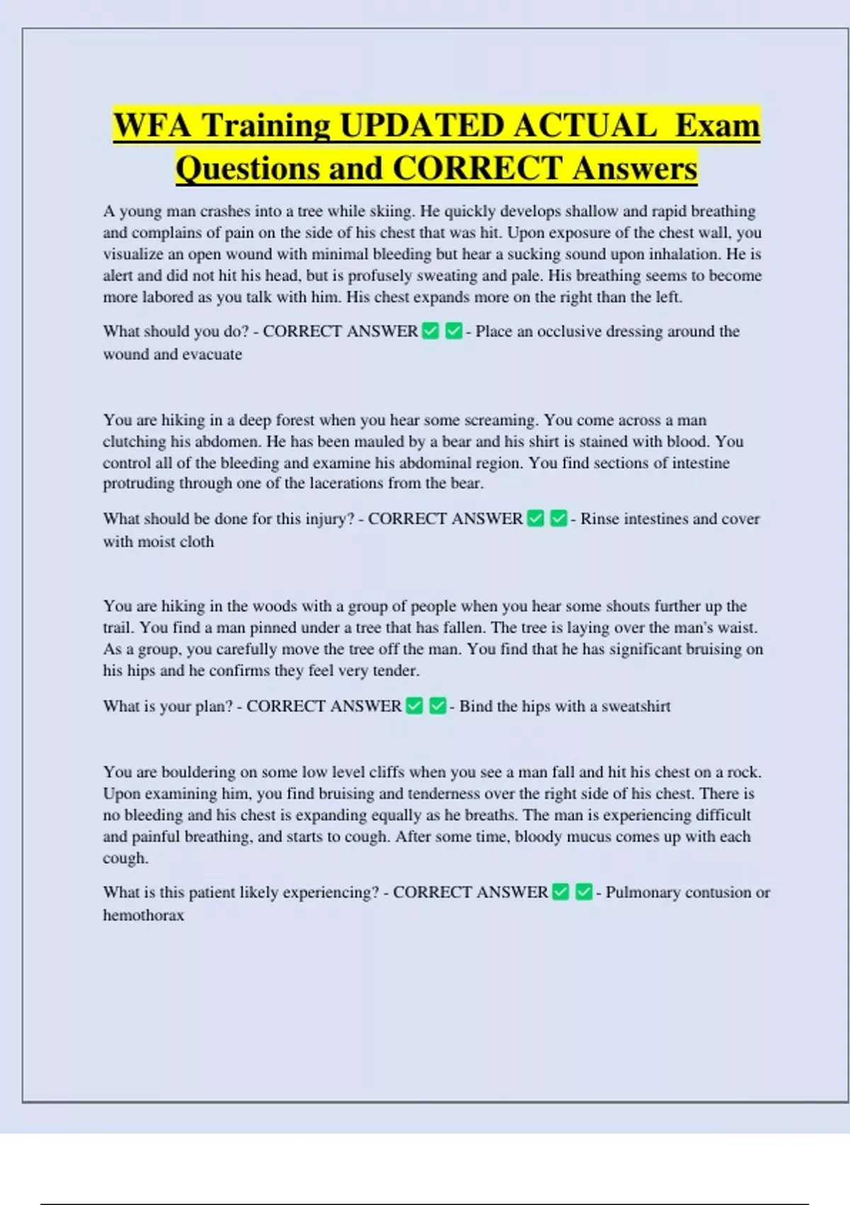 WFA Training UPDATED ACTUAL Exam Questions and CORRECT Answers A young man crashes into a tree while skiing. He quickly develops shallow and rapid breathing and complains of pain on the side of his chest that was hit. Upon exposure of the chest wall, you visualize an open wound with minimal bleeding but hear a sucking sound upon inhalation. He is alert and did not hit his head, but is profusely sweating and pale. His breathing seems to become more labored as you talk with him. His chest expands more on the right than the left. What should you do? - CORRECT ANSWER wound and evacuate - Place an occlusive dressing around the You are hiking in a deep forest when you hear some screaming. You come across a man clutching his abdomen. He has been mauled by a bear and his shirt is stained with blood. You control all of the bleeding and examine his abdominal region. You find sections of intestine protruding through one of the lacerations from the bear. What should be done for this injury? - CORRECT ANSWER with moist cloth - Rinse intestines and cov