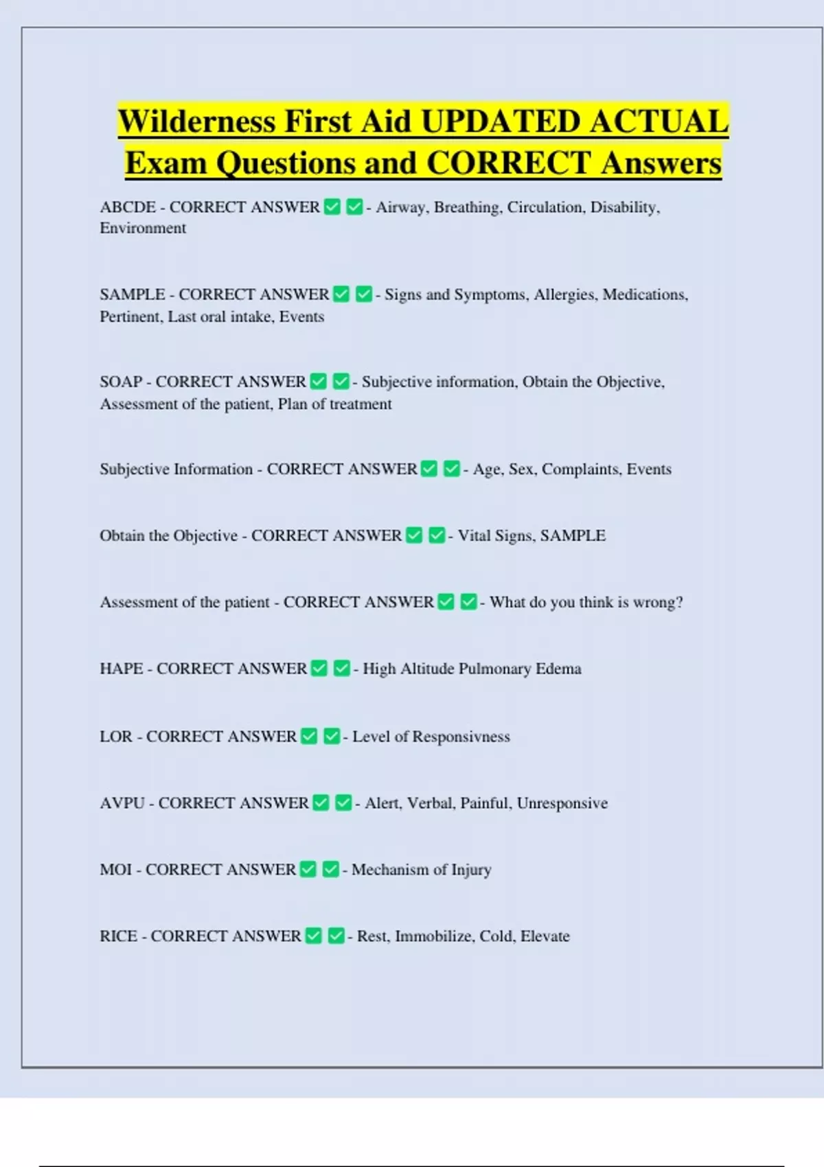 Wilderness First Aid UPDATED ACTUAL Exam Questions and CORRECT Answers ABCDE - CORRECT ANSWER Environment SAMPLE - CORRECT ANSWER Pertinent, Last oral intake, Events SOAP - CORRECT ANSWER - Airway, Breathing, Circulation, Disability, - Signs and Symptoms, Allergies, Medications, - Subjective information, Obtain the Objective, Assessment of the patient, Plan of treatment Subjective Information - CORRECT ANSWER Obtain the Objective - CORRECT ANSWER Assessment of the patient - CORRECT ANSWER HAPE - CORRECT ANSWER - Age, Sex, Complaints, Events