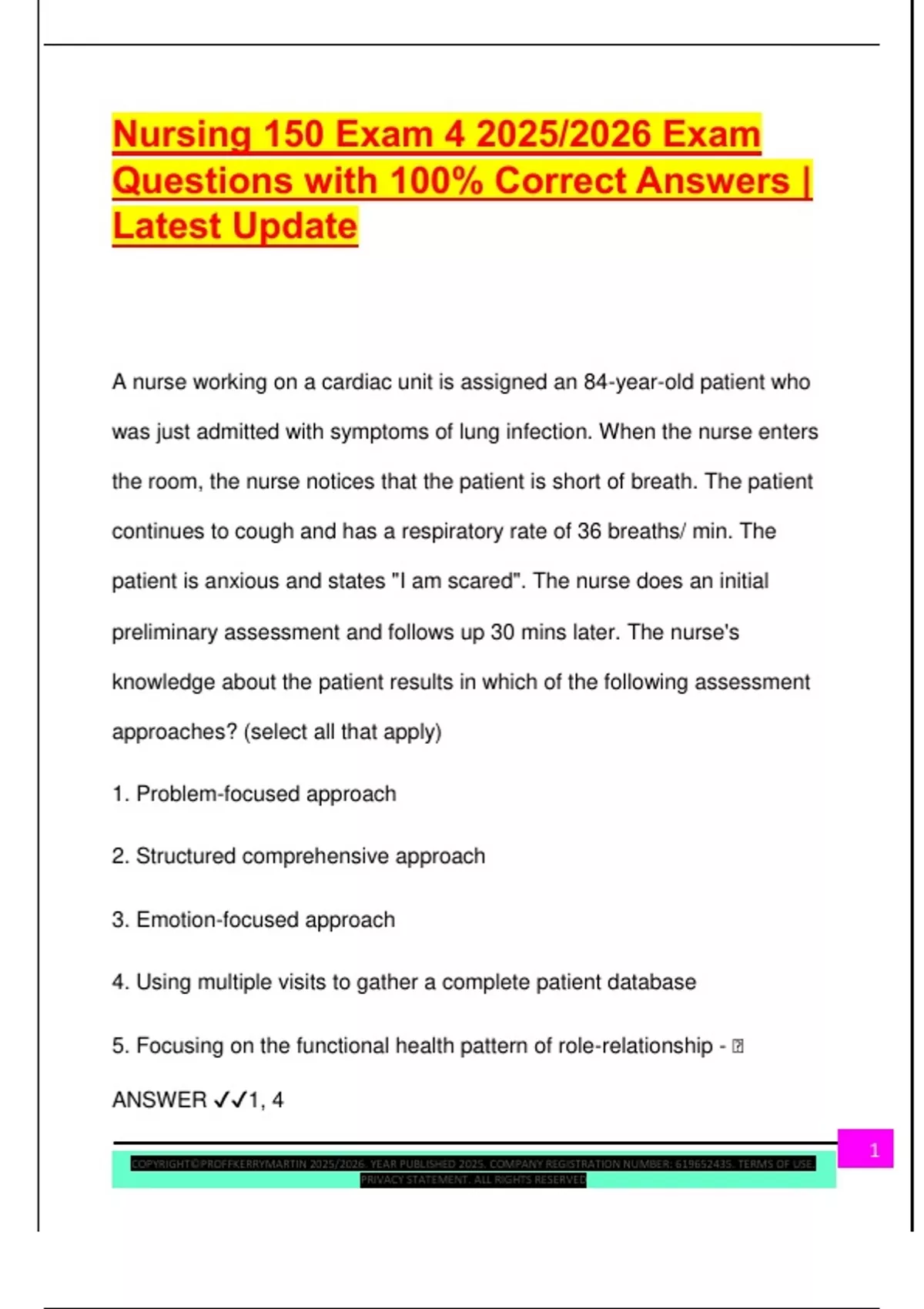 Nursing 150 Exam 4 2025/2026 Exam Questions with 100% Correct Answers | Latest Update A nurse working on a cardiac unit is assigned an 84-year-old patient who was just admitted with symptoms of lung infection. When the nurse enters the room, the nurse notices that the patient is short of breath. The patient continues to cough and has a respiratory rate of 36 breaths/ min. The patient is anxious and states "I am scared". The nurse does an initial preliminary assessment and follows up 30 mins later. The nurse's knowledge about the patient results in which of the following assessment approaches? (select all that apply) 1. Problem-focused approach 2. Structured comprehensive approach 3. Emotion-focused approach 4. Using multiple visits to gather a complete patient database 5. Focusing on the functional health pattern of role-relationship -
