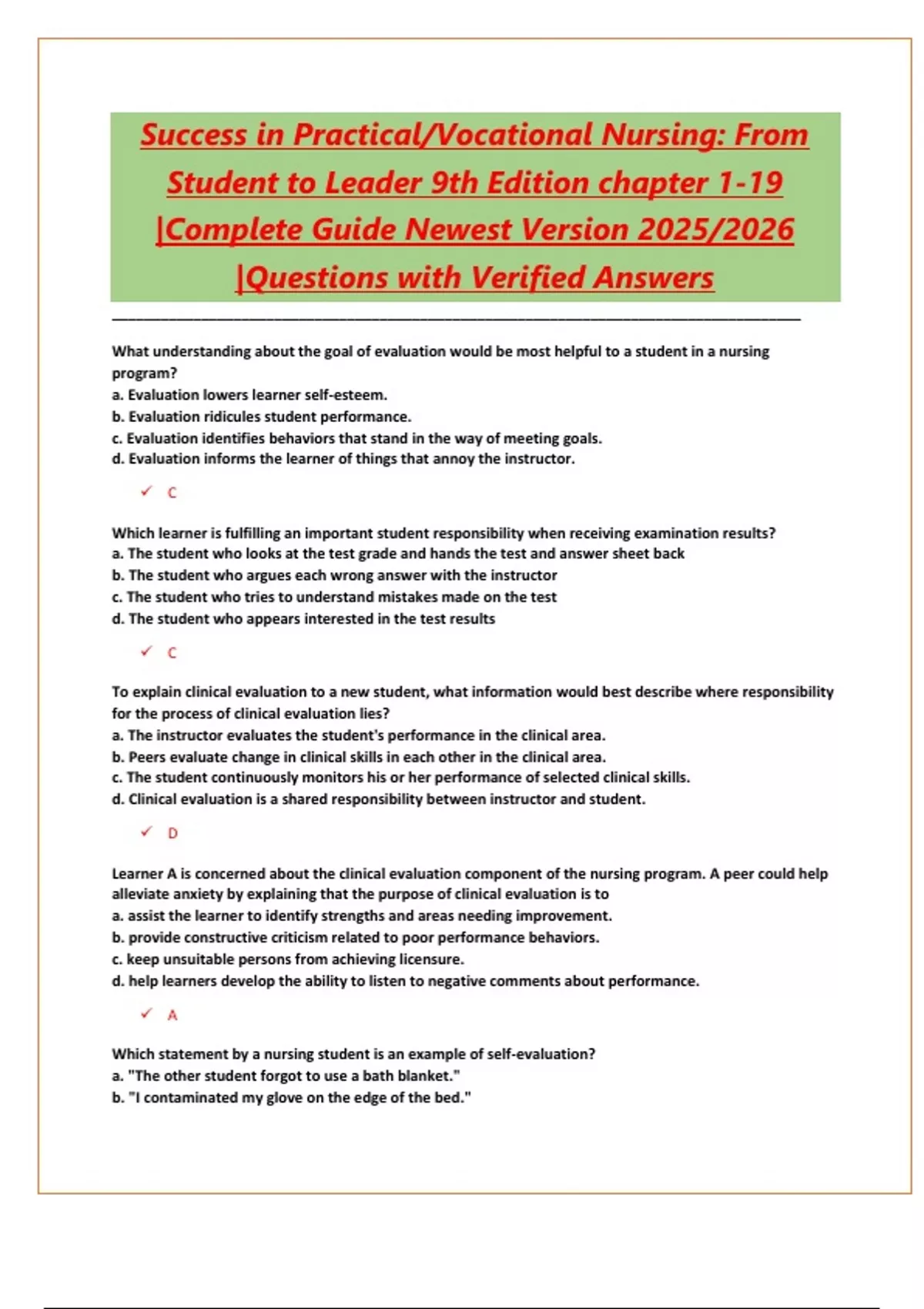 Success in Practical/Vocational Nursing: From Student to Leader 9th Edition chapter 1-19 |Complete Guide Newest Version 2025/2026 |Questions with Verified Answers