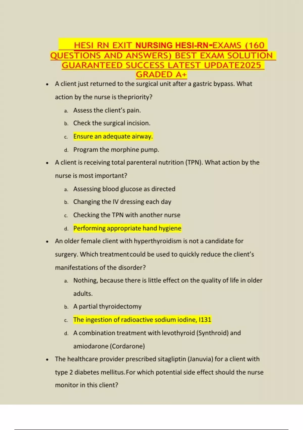 HESI RN EXIT NURSING HESI-RN-EXAMS (160 QUESTIONS AND ANSWERS) BEST EXAM SOLUTION GUARANTEED SUCCESS LATEST UPDATE2025 GRADED A+