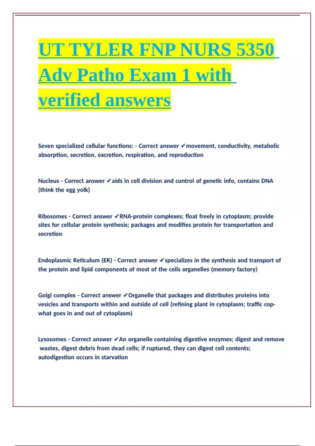 UT TYLER FNP NURS 5350 Adv Patho Exam 1 with verified answers