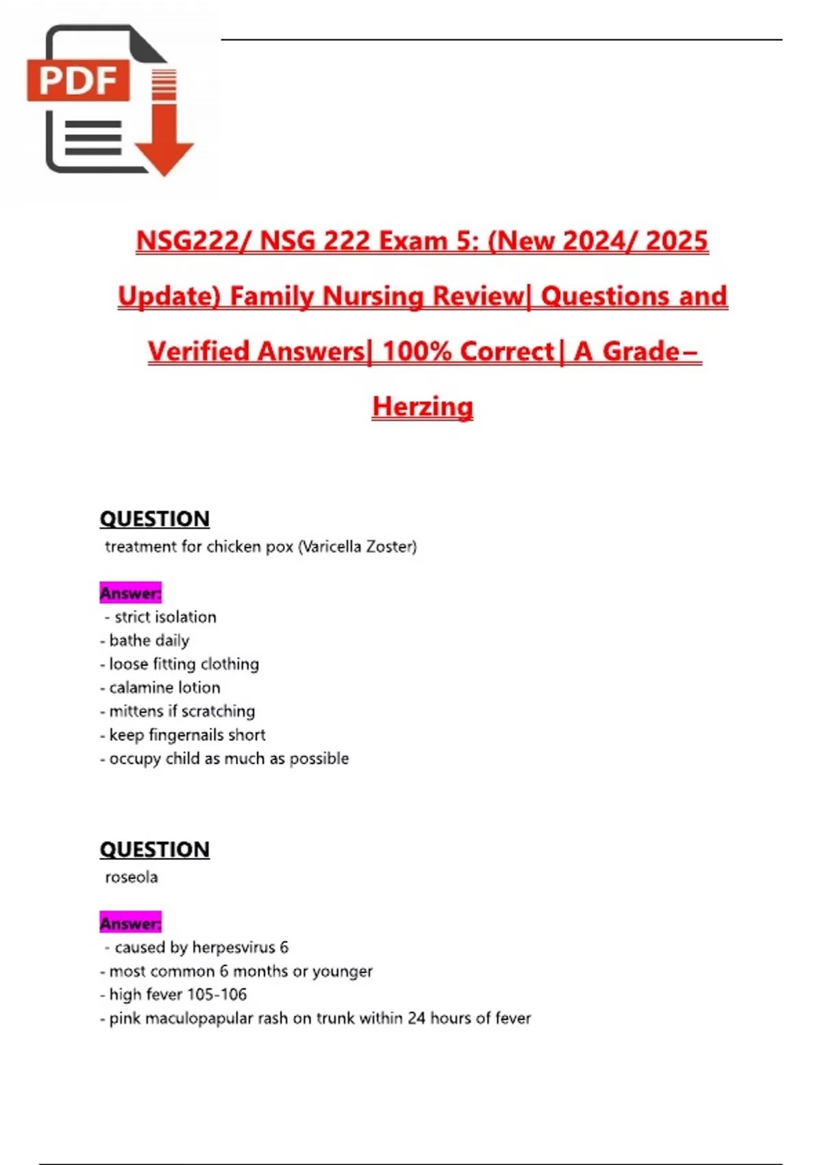 This document provides an updated 2025 collection of review questions and verified answers for Family Nursing. It covers a wide range of topics including maternal and child health, family-centered care, chronic illness management, and developmental stages. Ideal for students preparing for the NCLEX or nursing school exams, each question includes clear, concise answers to reinforce key concepts.