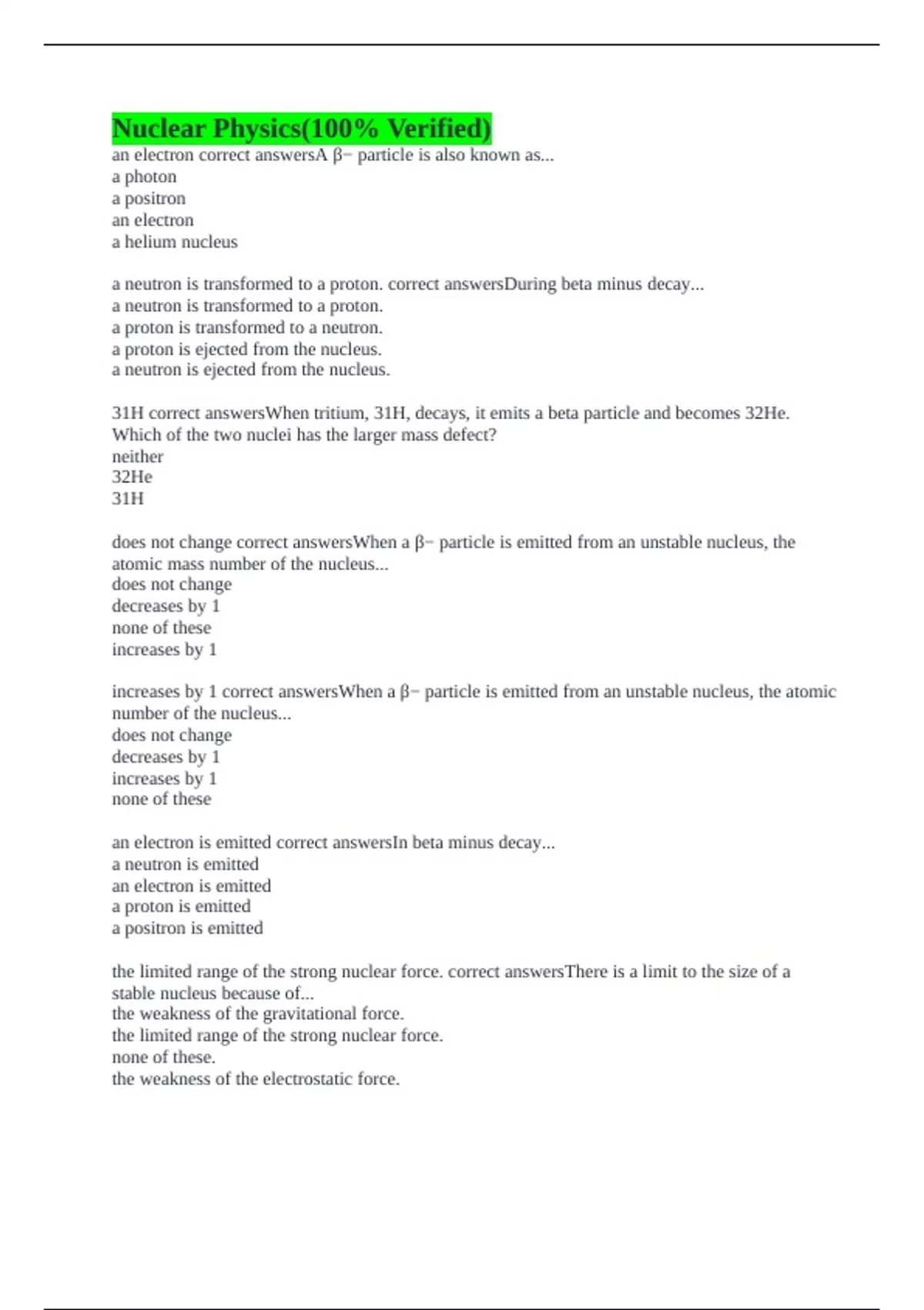 an electron correct answersA β− particle is also known as... a photon a positron an electron a helium nucleus a neutron is transformed to a proton. correct answersDuring beta minus decay... a neutron is transformed to a proton. a proton is transformed to a neutron. a proton is ejected from the nucleus. a neutron is ejected from the nucleus. 31H correct answersWhen tritium, 31H, decays, it emits a beta particle and becomes 32He. Which of the two nuclei has the larger mass defect? neither 32He 31H does not change correct answersWhen a β− particle is emitted from an unstable nucleus, the atomic mass number of the nucleus... does not change decreases by 1 none of these increases by 1 increases by 1 correct answersWhen a β− particle is emitted from an unstable nucleus, the atomic number of the nucleus... does not change decreases by 1 increases by 1 none of these an electron is emitted correct answersIn beta minus decay... a neutron is emitted an electron is emitted a proton is emitted a positron is emitted the limited range of the strong nuclear force. correct answersThere is a limit to the size of a stable nucleus because of... the weakness of the gravitational force. the limited range of the strong nuclear force. none of these. the weakness of the electrostatic force.