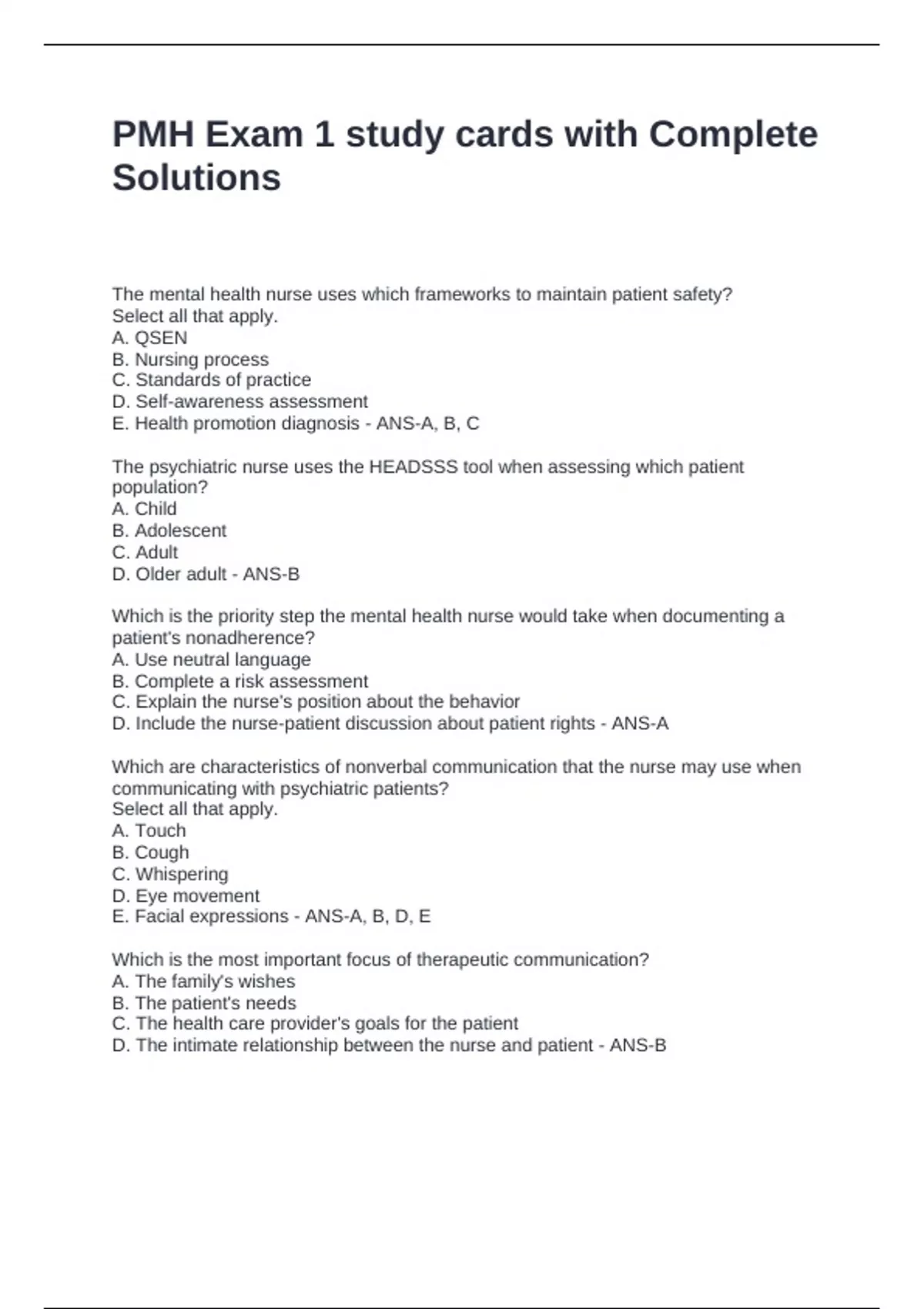 PMH Exam 1 study cards with Complete Solutions