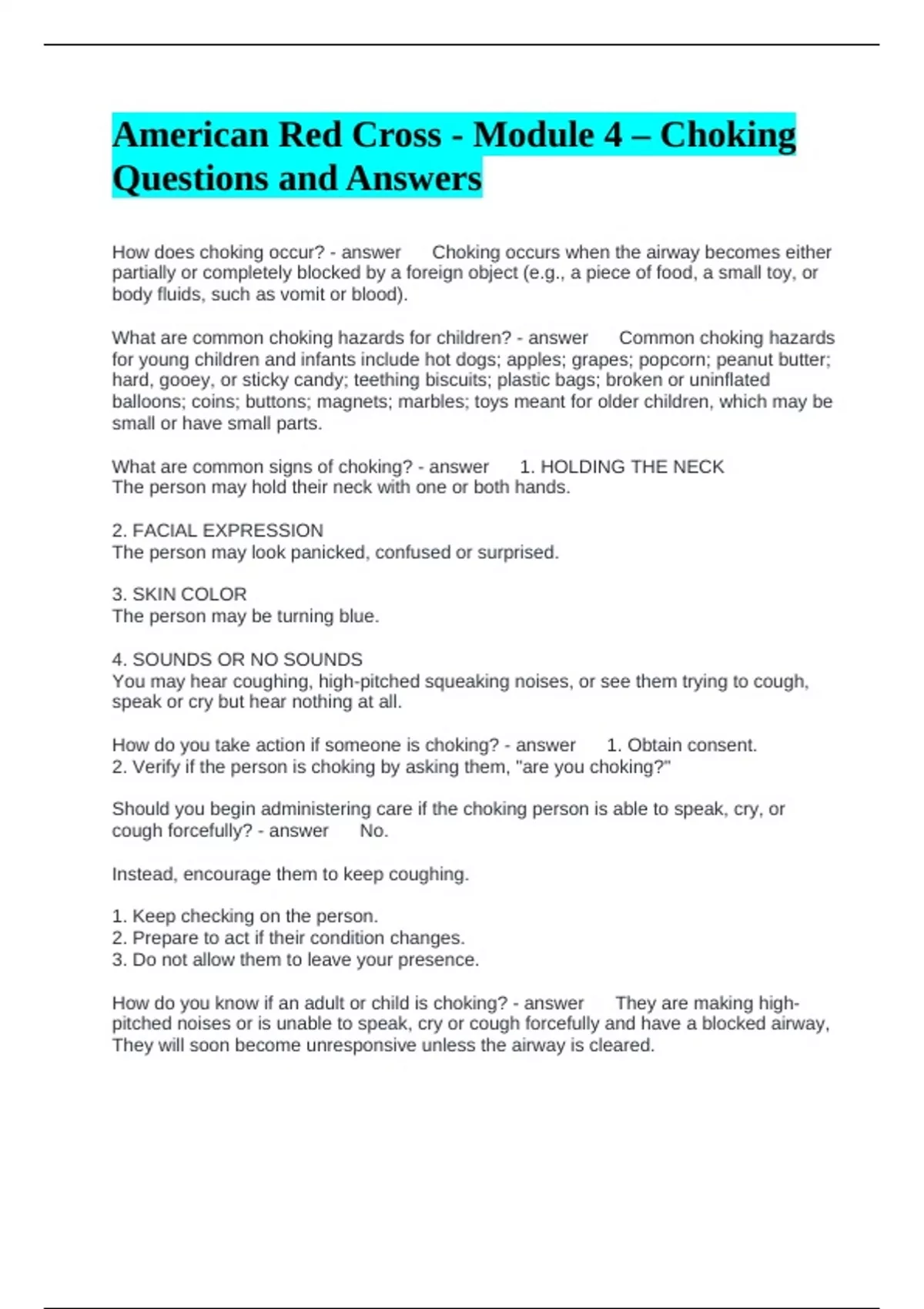 American Red Cross - Module 4 – Choking Questions and Answers