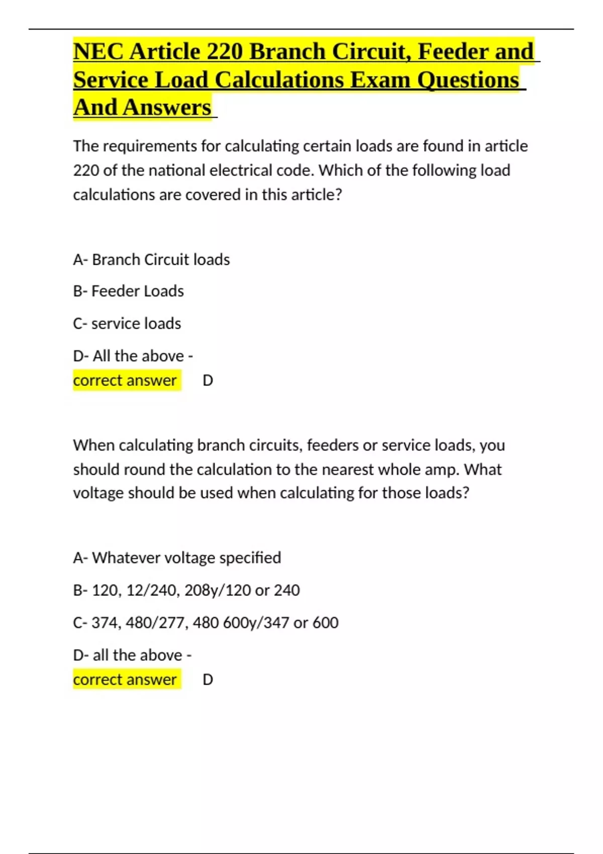 NEC Article 220 Branch Circuit, Feeder and Service Load Calculations Exam Questions And A