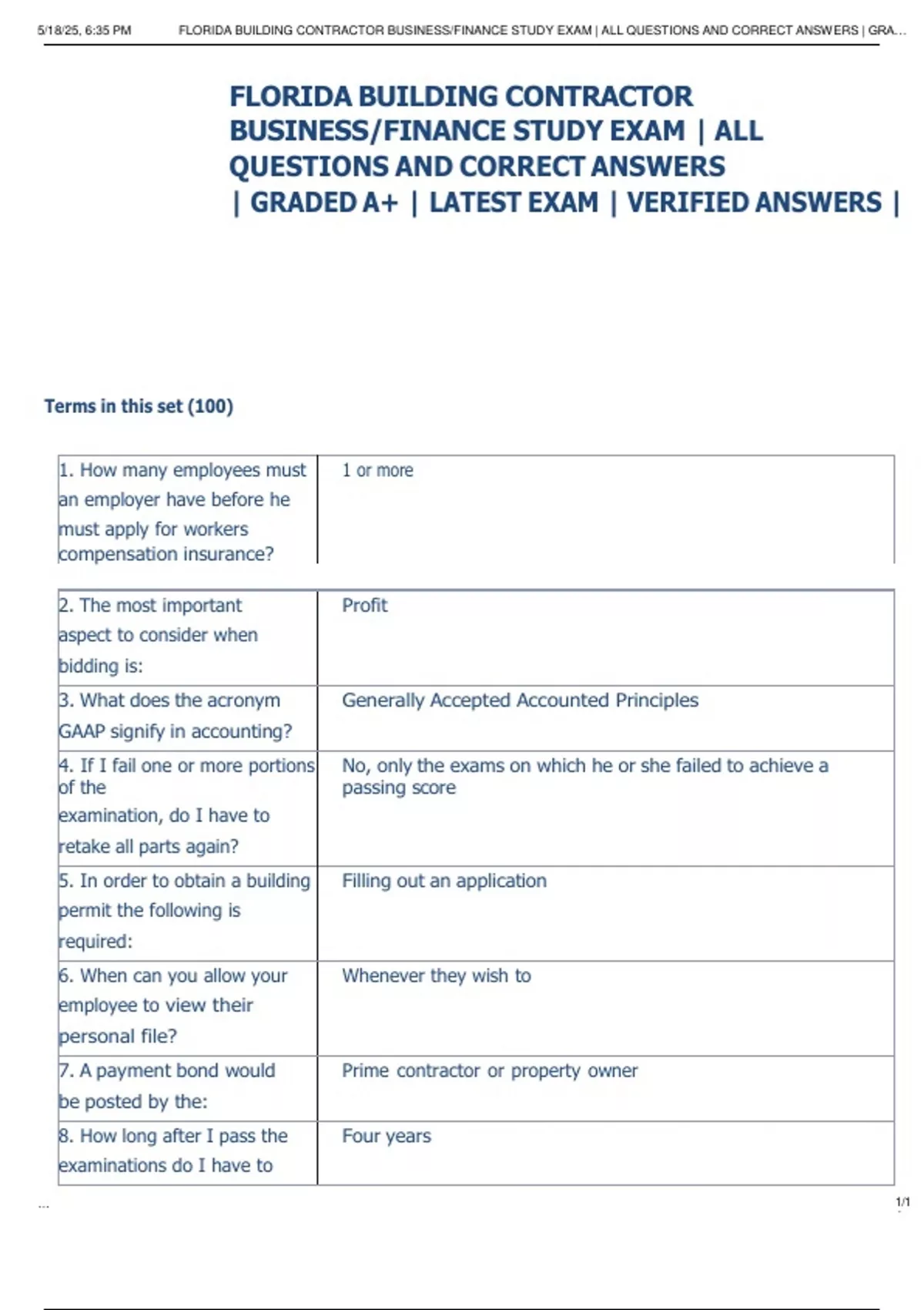 5/18/25, 6:35 PM FLORIDA BUILDING CONTRACTOR BUSINESS/FINANCE STUDY EXAM | ALL QUESTIONS AND CORRECT ANSWERS | GRA…
