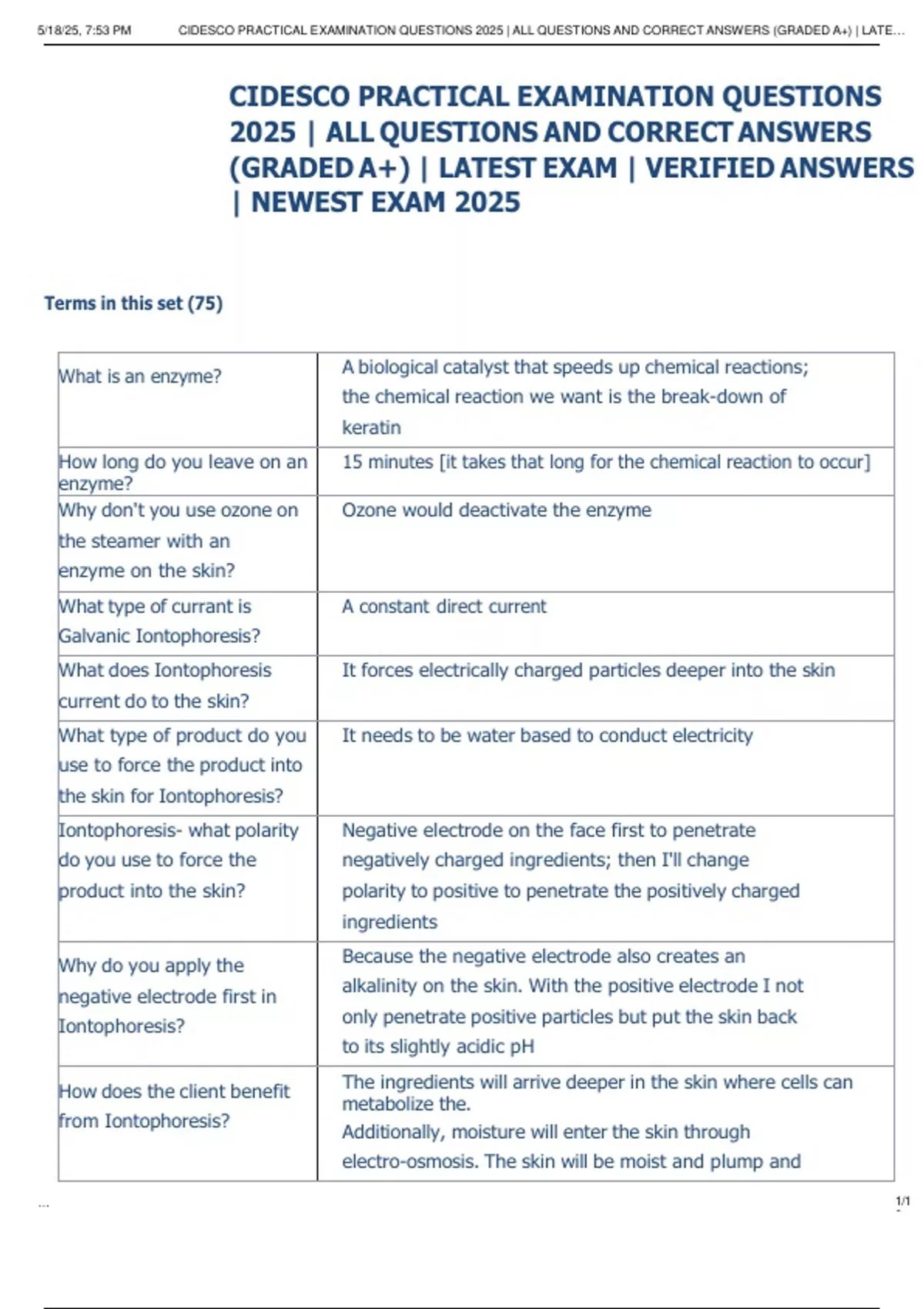 , 5/18/25, 7:53 PM CIDESCO PRACTICAL EXAMINATION QUESTIONS 2025 | ALL QUESTIONS AND CORRECT ANSWERS (GRADED A+) | LATE…