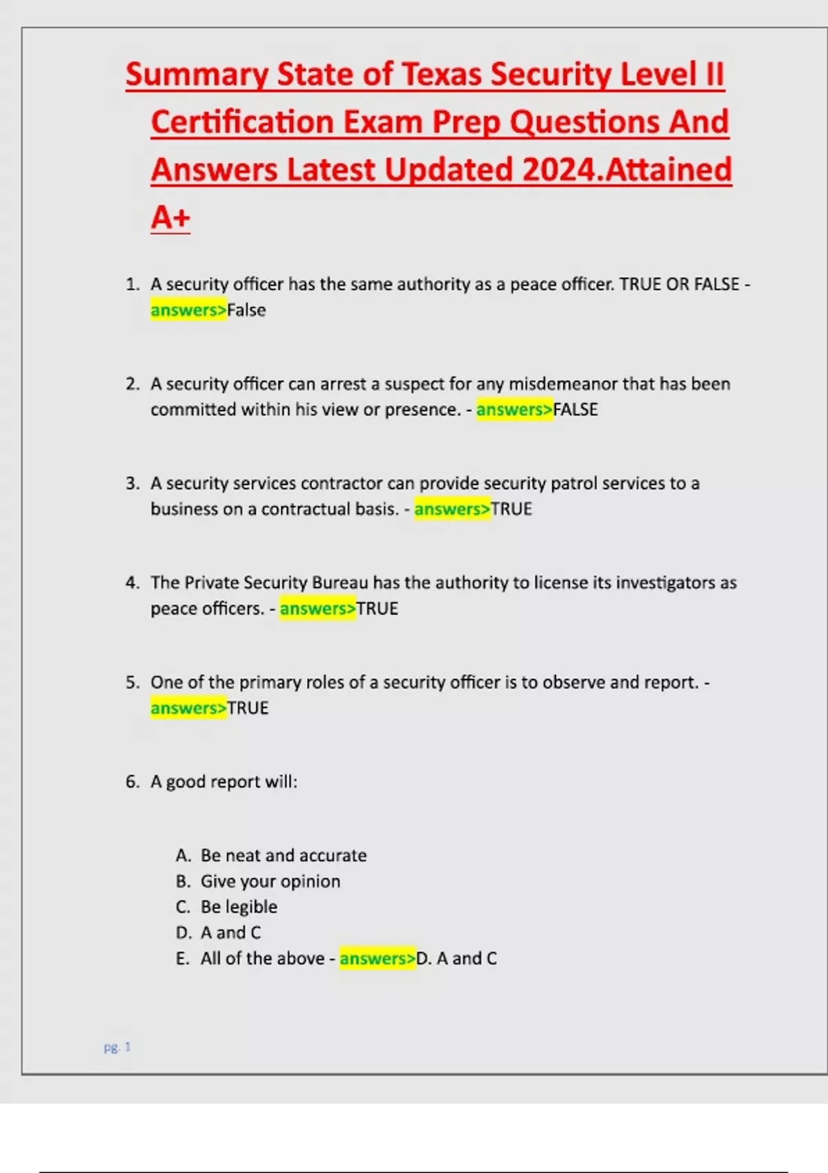 Summary State of Texas Security Level II Certification Exam Prep Questions And Answers Latest Updated 2024.Attained A+