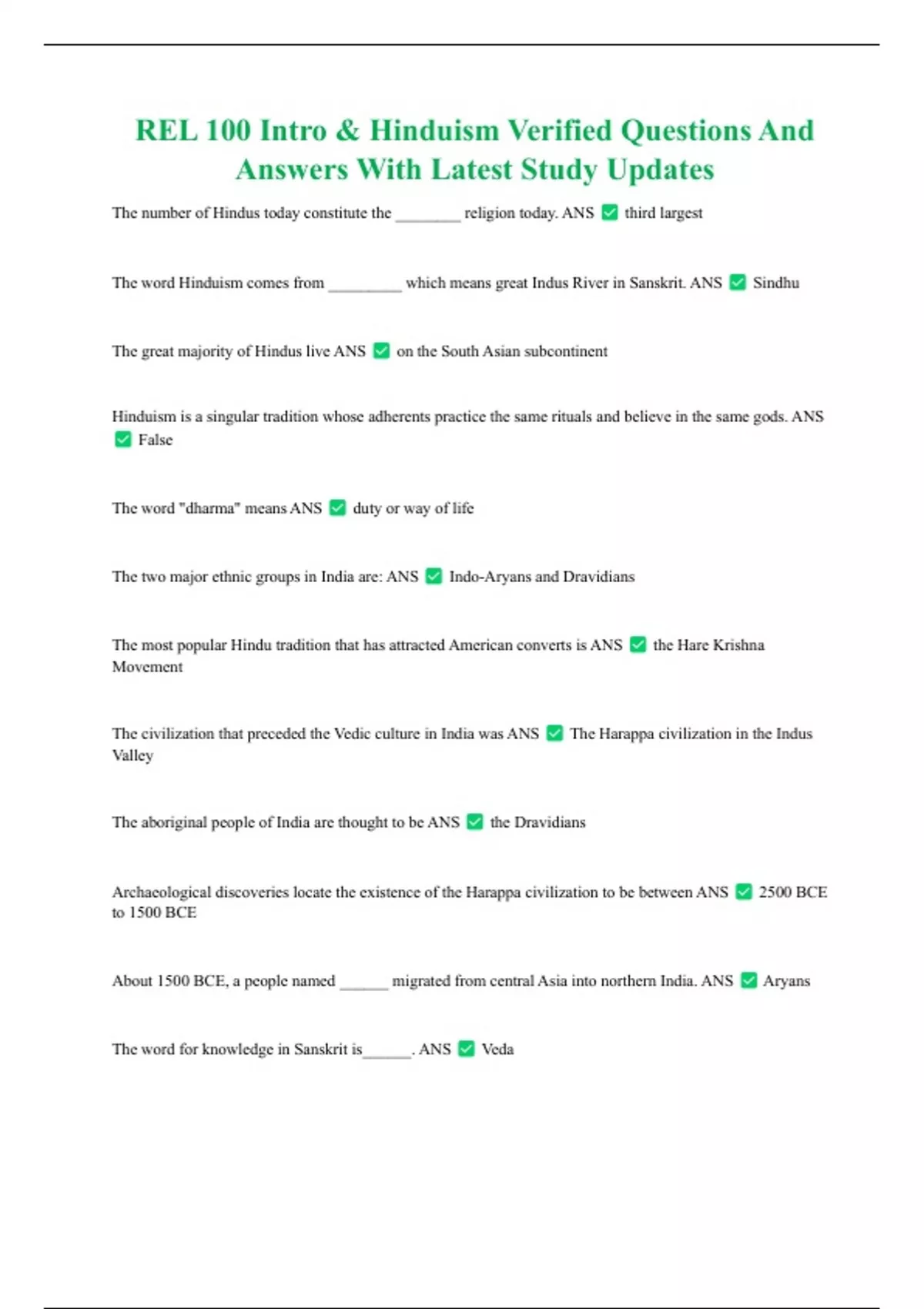 REL 100 Intro & Hinduism Verified Questions And Answers With Latest Study Updates