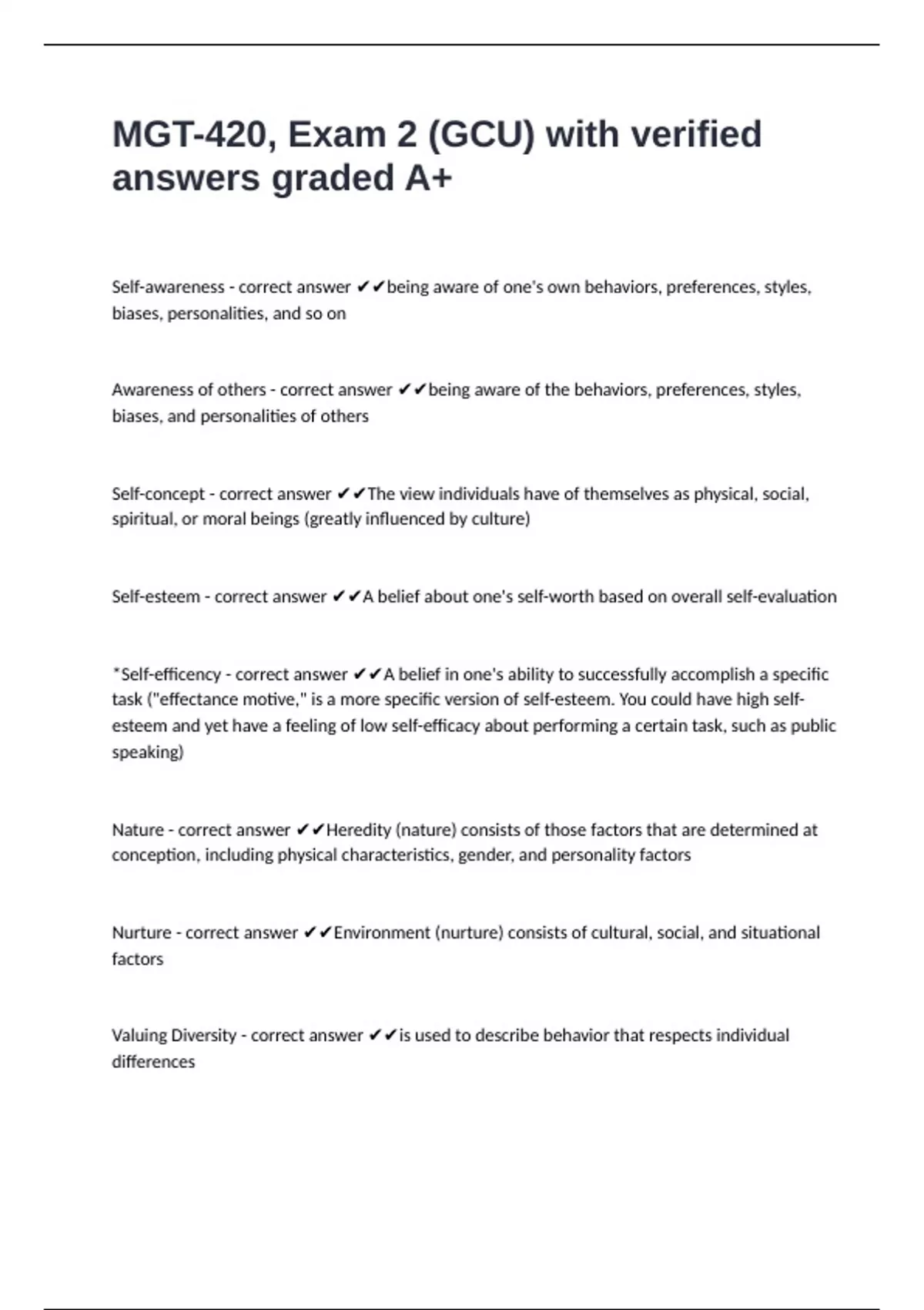 Self-esteem - correct answer ✔✔A belief about one's self-worth based on overall self-evaluation