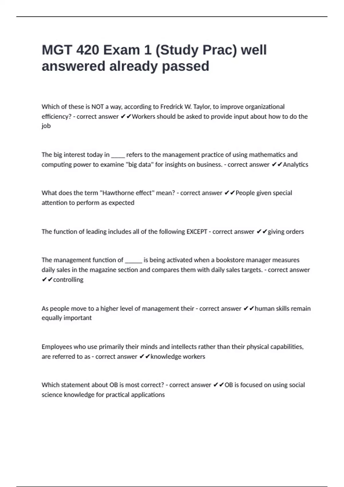 MGT 420 Exam 1 (Study Prac) well answered already passed