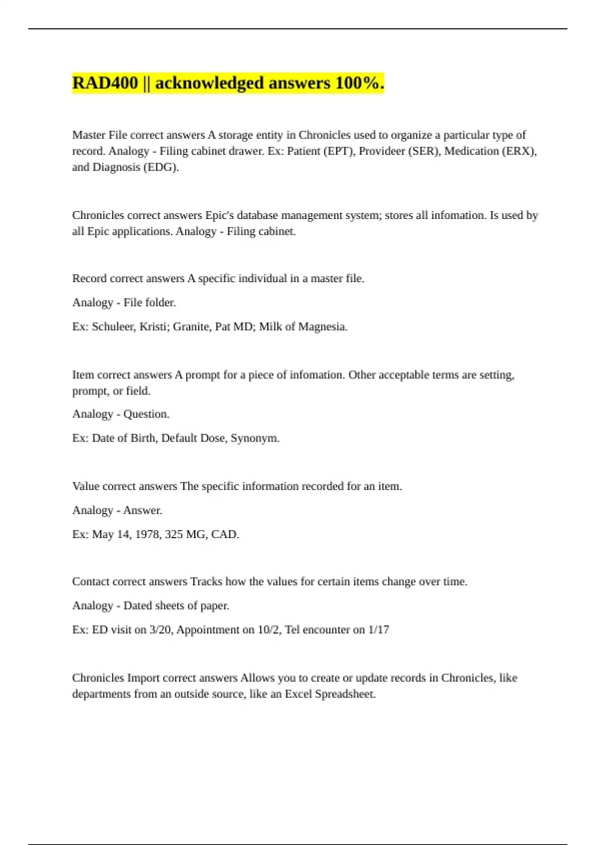 Chronicles correct answers Epic's database management system; stores all infomation. Is used by