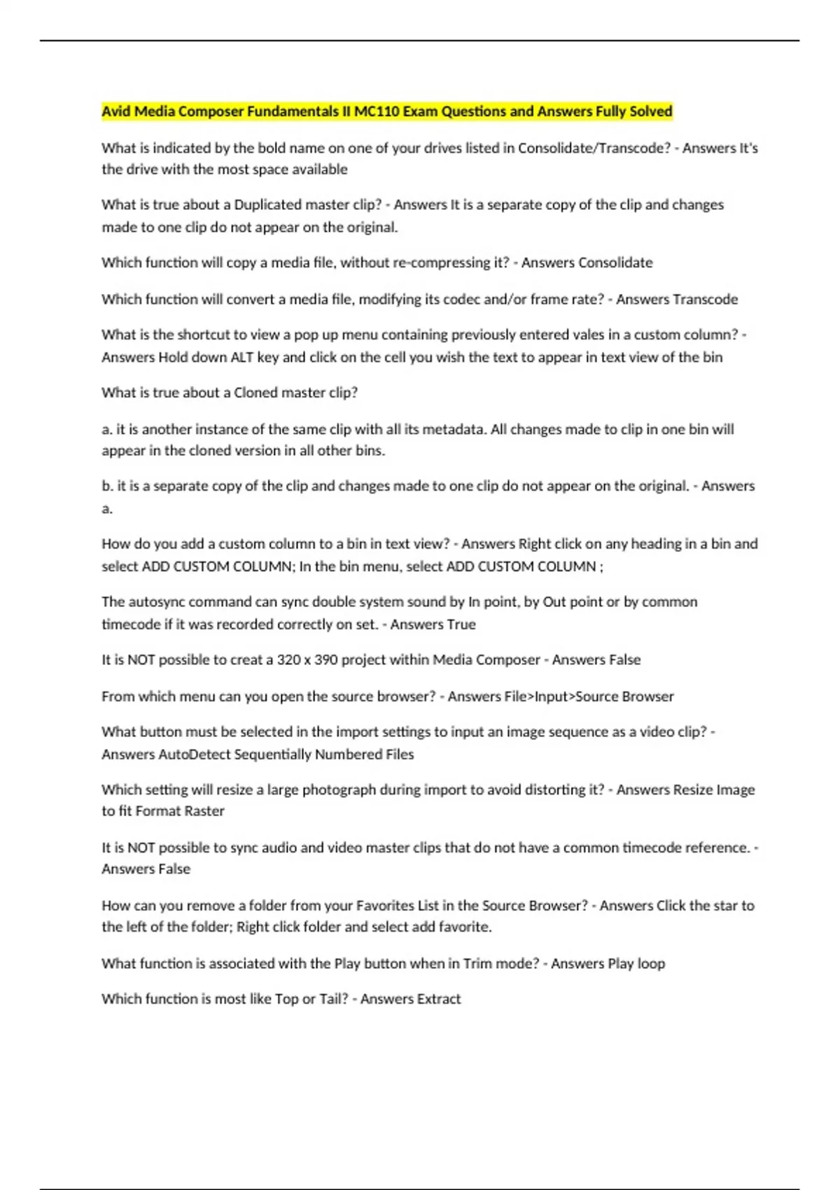 Avid Media Composer Fundamentals II MC110 Exam Questions and Answers Fully Solved What is indicated by the bold name on one of your drives listed in Consolidate/Transcode? - Answers It's the drive with the most space available What is true about a Duplicated master clip? - Answers It is a separate copy of the clip and changes made to one clip do not appear on the original. Which function will copy a media file, without re-compressing it? - Answers Consolidate Which function will convert a media file, modifying its codec and/or frame rate? - Answers Transcode What is the shortcut to view a pop up menu containing previously entered vales in a custom column? - Answers Hold down ALT key and click on the cell you wish the text to appear in text view of the bin What is true about a Cloned master clip? a. it is another instance of the same clip with all its metadata. All changes made to clip in one bin will appear in the cloned version in all other bins. b. it is a separate copy of the clip and changes made to one clip do not appear on the original. - Answers a. How do you add a custom column to a bin in text view? - Answers Right click on any heading in a bin and select ADD CUSTOM COLUMN; In the bin menu, select ADD CUSTOM COLUMN ; The autosync command can sync double system sound by In point, by Out point or by common timecode if it was recorded correctly on set. - Answers True It is NOT possible to creat a 320 x 390 project within Media Composer - Answers False From which menu can you open the source browser? - Answers File>Input>Source Browser What button must be selected in the import settings to input an image sequence as a video clip? - Answers AutoDetect Sequentially Numbered Files Which setting will resize a large photograph during import to avoid distorting it? - Answers Resize Image to fit Format Raster It is NOT possible to sync audio and video master clips that do not have a common timecode reference. - Answers False How can you remove a folder from your Favorites List in the Source Browser? - Answers Click the star to the left of the folder; Right click folder and select add favorite. What function is associated with the Play button when in Trim mode? - Answers Play loop Which function is most like Top or Tail? - Answers Extract You want to search for a timecode of 1:14:07:00. The source TC1 display in the Source monitor currently reads 01:12:32:05. what should you type to get to the location you are looking for? - Answers Enter 140700 or 1:14:07:00 on the numeric keypad and hit enter. How can you define the material you want to copy from a sequence? - Answers Mark In and Out around segment or frames you want to select and select the tracks What are two ways to create a sub-sequence? - Answers Load sequence into record monitor Mark in and out on timeline select tracks and drag sequence icon from record monitor to a bin.; Load sequence into record monitor Mark in and out on timeline select tracks and alt-drag the picture from record monitor to the destination bin. What function can be used to create a series of jumpcuts in the sequence? - Answers Extract which keys trim left or right eight frames at a time? - Answers M and / To backtime an edit create a three point edit utilizing only an outpoint on either the source or the sequence, the system will match the outpoint of the source and sequence and calculate the forth point by the duration to the corresponding inpoint. - Answers True You cannot use filler to maintain sync when trimming with multiple tracks of audio or video? - Answers False What is the difference between find and sift> - Answers A sift is applied to contents of a bin only, Find can search multiple bin What is a split edit? - Answers A split edit is where audio and video transition at different points in time. What is the Process of creating a split edit while maintaining sync downstream? - Answers Use trim tool, dual roller trim to trim either the video or audio tracks to change the transition point earlier or later in the sequence. How can you ensure that you maintain sync while using ripple trim? - Answers Whenever you add or subtract frames from one track, also add or subtract them equally for all other tracks in the timeline.; Turn sync locks on all tracks; Hold down alt and click add edit button, then select all tracks for the ripple trim, where there are no events filler will be added. When navigating by timecode, what is the difference between typing + 30:00 and -30:00 - Answers +30 will move the position indicator forward 30 secs, -30 will move the position indicator backwards 30 secs T or F: The below is a good process to restore sync, using sync break indicator in media composer.