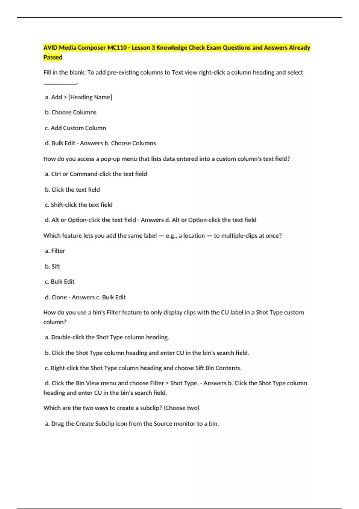 AVID Media Composer MC110 - Lesson 3 Knowledge Check Exam Questions and Answers Already Passed Fill in the blank: To add pre-existing columns to Text view right-click a column heading and select __________. a. Add > [Heading Name] b. Choose Columns c. Add Custom Column d. Bulk Edit - Answers b. Choose Columns How do you access a pop-up menu that lists data entered into a custom column's text field? a. CtrI or Command-click the text field b. Click the text field c. Shift-click the text field d. Alt or Option-click the text field - Answers d. Alt or Option-click the text field Which feature lets you add the same label — e.g., a location — to multiple-clips at once? a. Filter b. Sift c. Bulk Edit d. Clone - Answers c. Bulk Edit How do you use a bin's Filter feature to only display clips with the CU label in a Shot Type custom column? a. Double-click the Shot Type column heading. b. Click the Shot Type column heading and enter CU in the bin's search field. c. Right-click the Shot Type column heading and choose Sift Bin Contents. d. Click the Bin View menu and choose Filter > Shot Type. - Answers b. Click the Shot Type column heading and enter CU in the bin's search field.