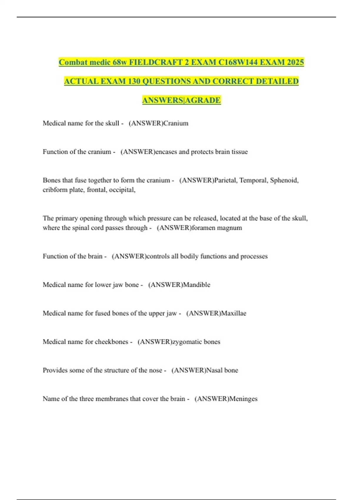 Combat medic 68w FIELDCRAFT 2 EXAM C168W144 EXAM 2025