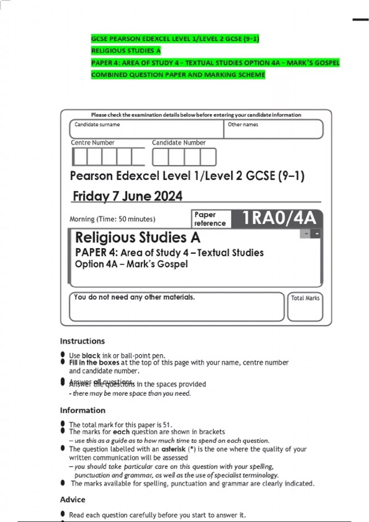 GCSE PEARSON EDEXCEL LEVEL 1/LEVEL 2 GCSE (9–1) RELIGIOUS STUDIES A PAPER 4: AREA OF STUDY 4 – TEXTUAL STUDIES OPTION 4A – MARK’S GOSPEL COMBINED QUESTION PAPER AND MARKING SCHEME