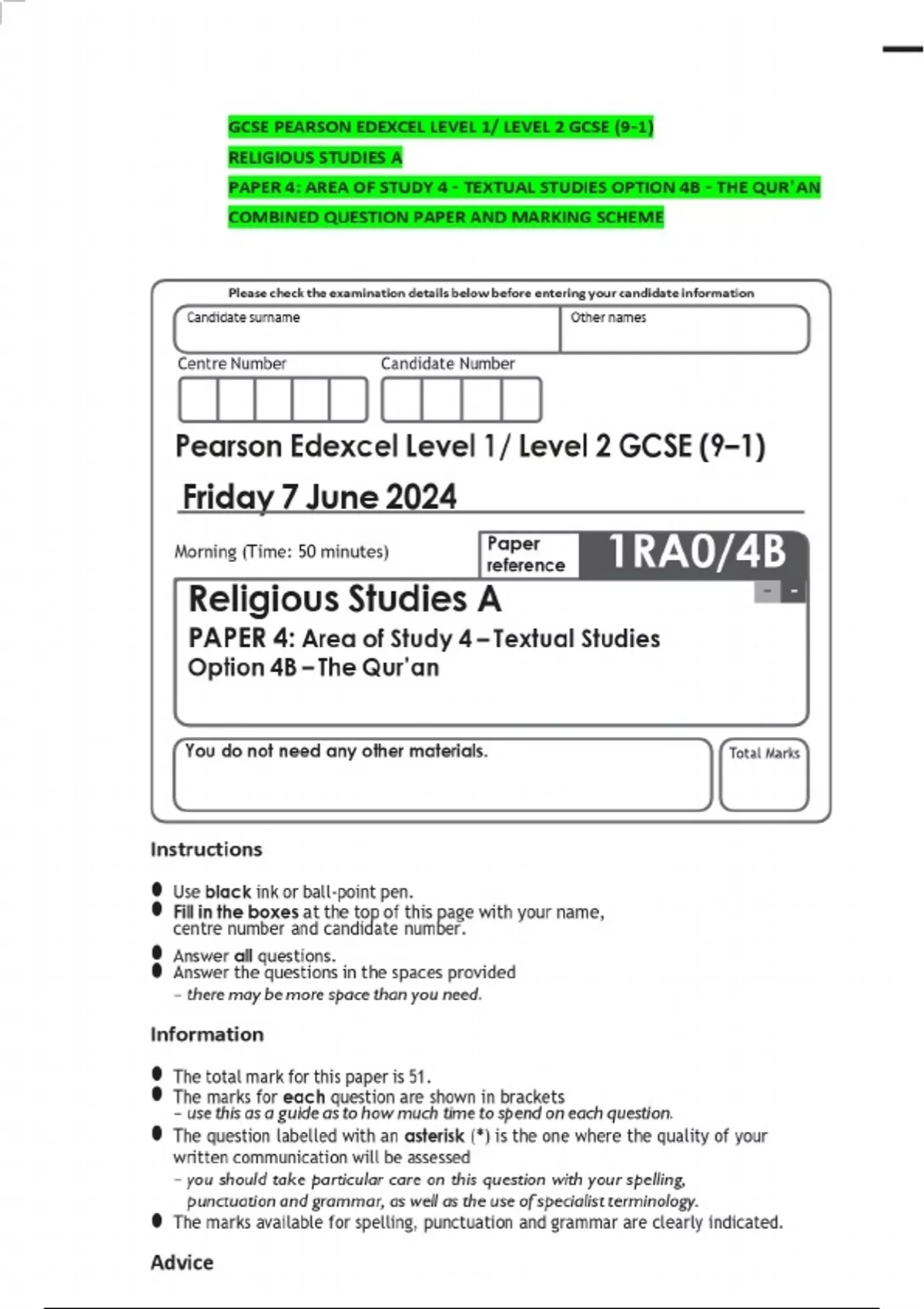 GCSE PEARSON EDEXCEL LEVEL 1/ LEVEL 2 GCSE (9–1) RELIGIOUS STUDIES A PAPER 4: AREA OF STUDY 4 – TEXTUAL STUDIES OPTION 4B – THE QUR’AN COMBINED QUESTION PAPER AND MARKING SCHEME