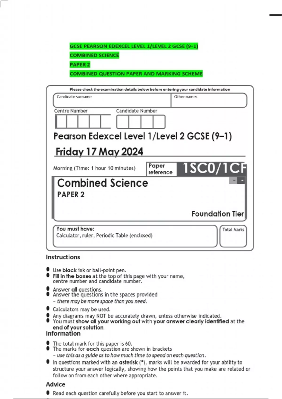 GCSE PEARSON EDEXCEL LEVEL 1/LEVEL 2 GCSE (9–1) COMBINED SCIENCE PAPER 2 COMBINED QUESTION PAPER AND MARKING SCHEME