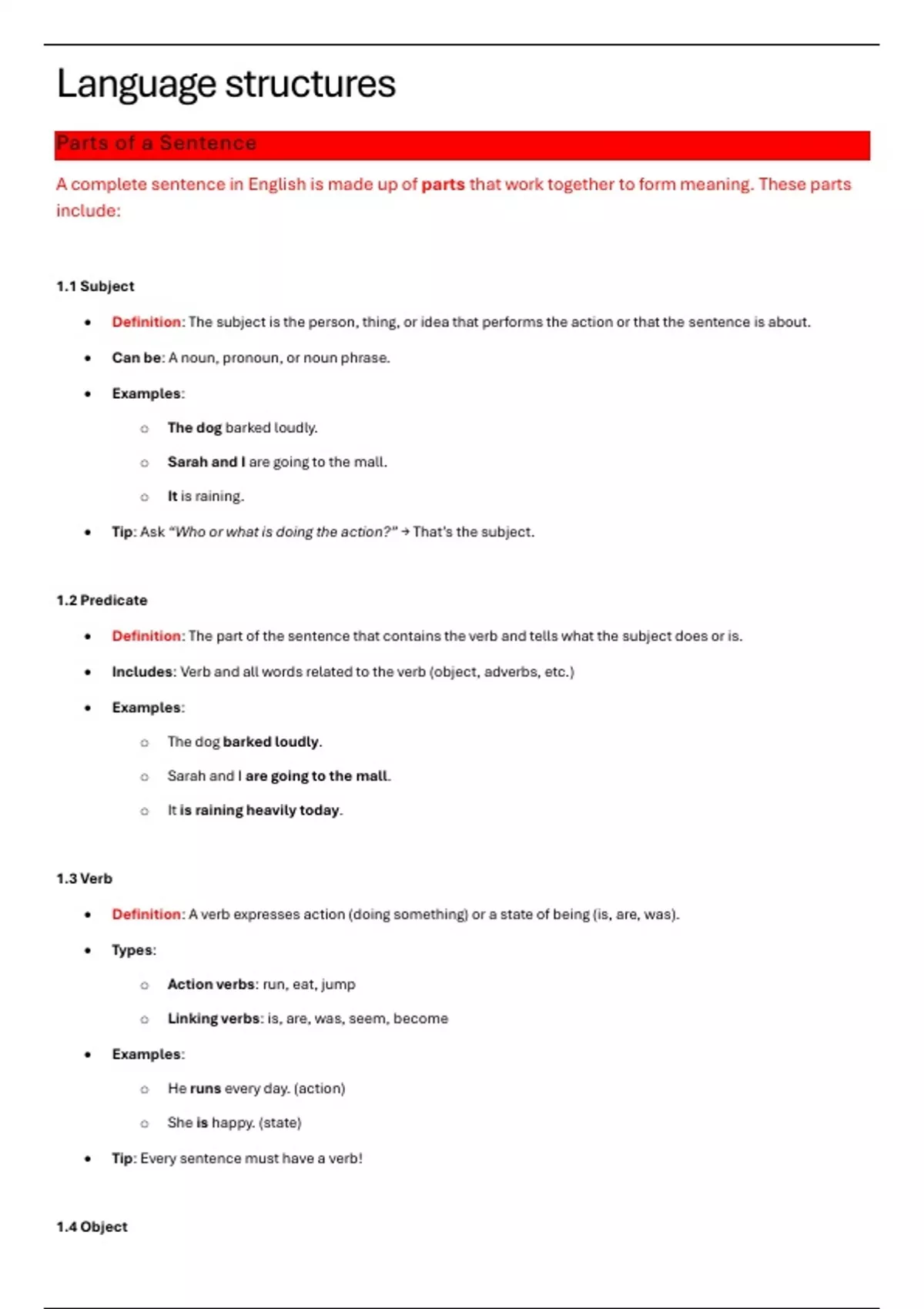 • Definition: The subject is the person, thing, or idea that performs the action or that the sentence is about.