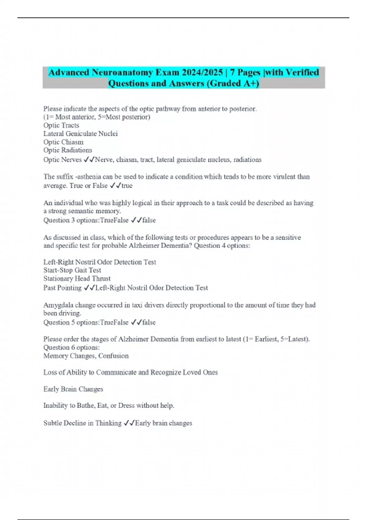 Advanced Neuroanatomy Exam 2024/2025 | 7 Pages |with Verified Questions and Answers (Graded A+)