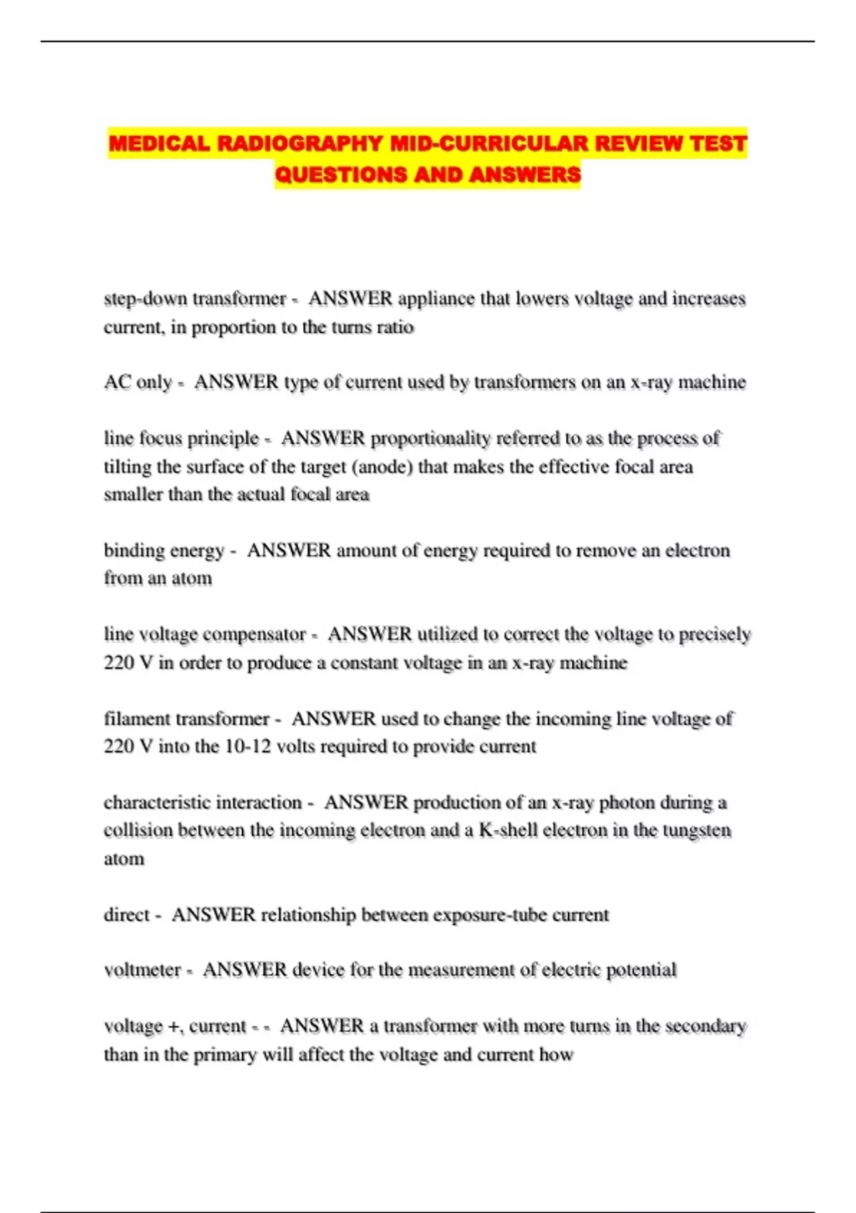 MEDICAL RADIOGRAPHY MID-CURRICULAR REVIEW TEST QUESTIONS AND ANSWERS....