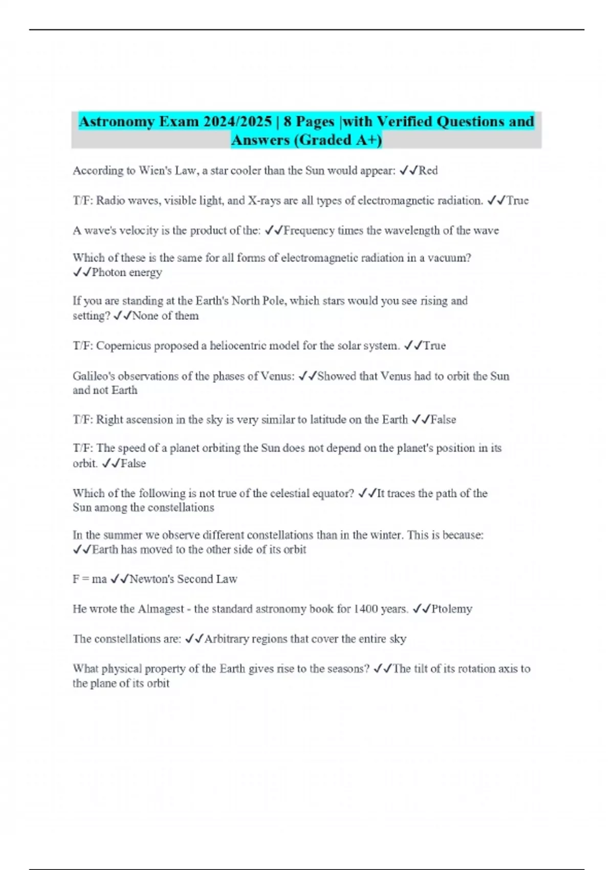 Astronomy Exam 2024/2025 | 8 Pages |with Verified Questions and Answers (Graded A+)