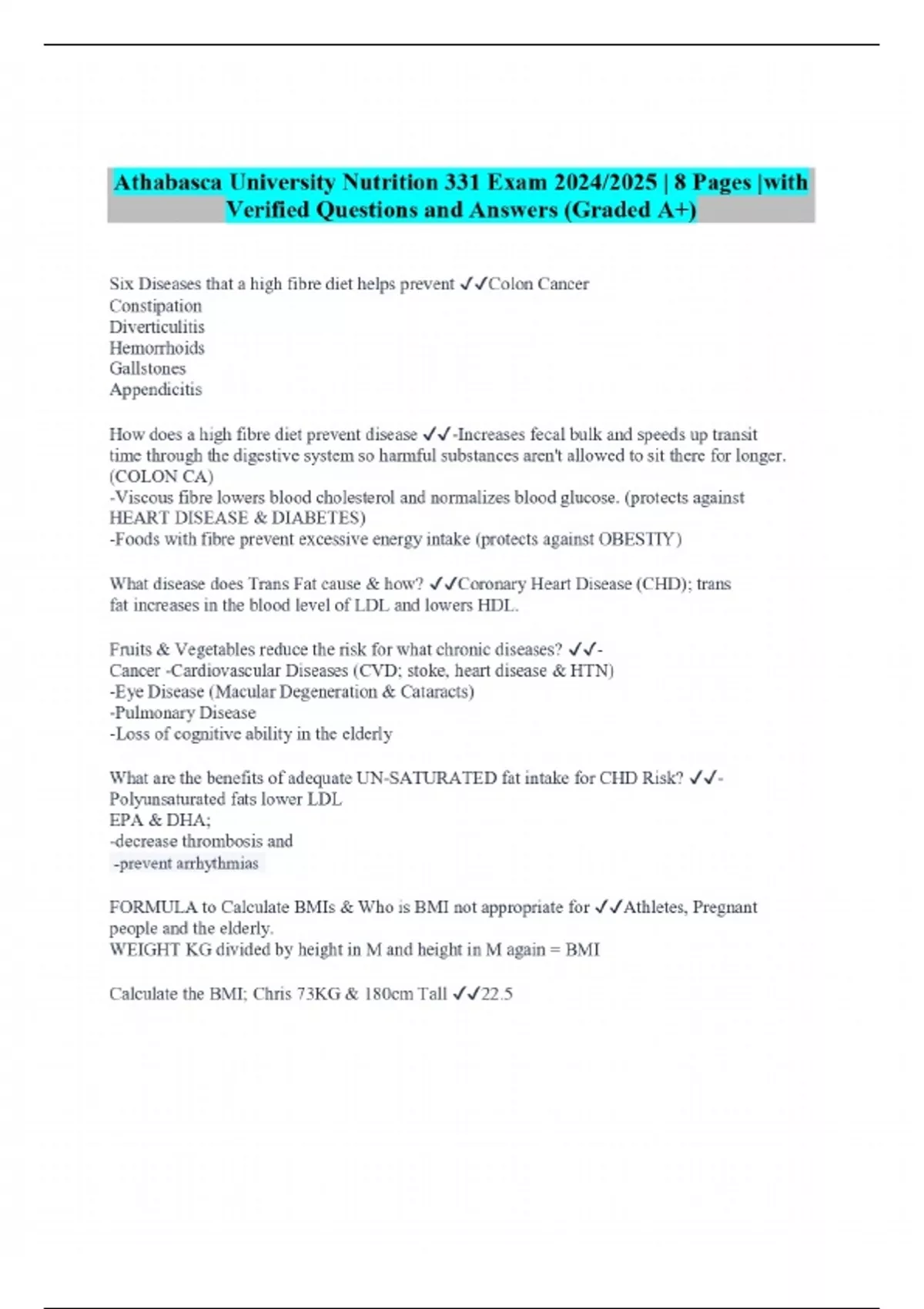 Athabasca University Nutrition 331 Exam 2024/2025 | 8 Pages |with Verified Questions and Answers (Graded A+)