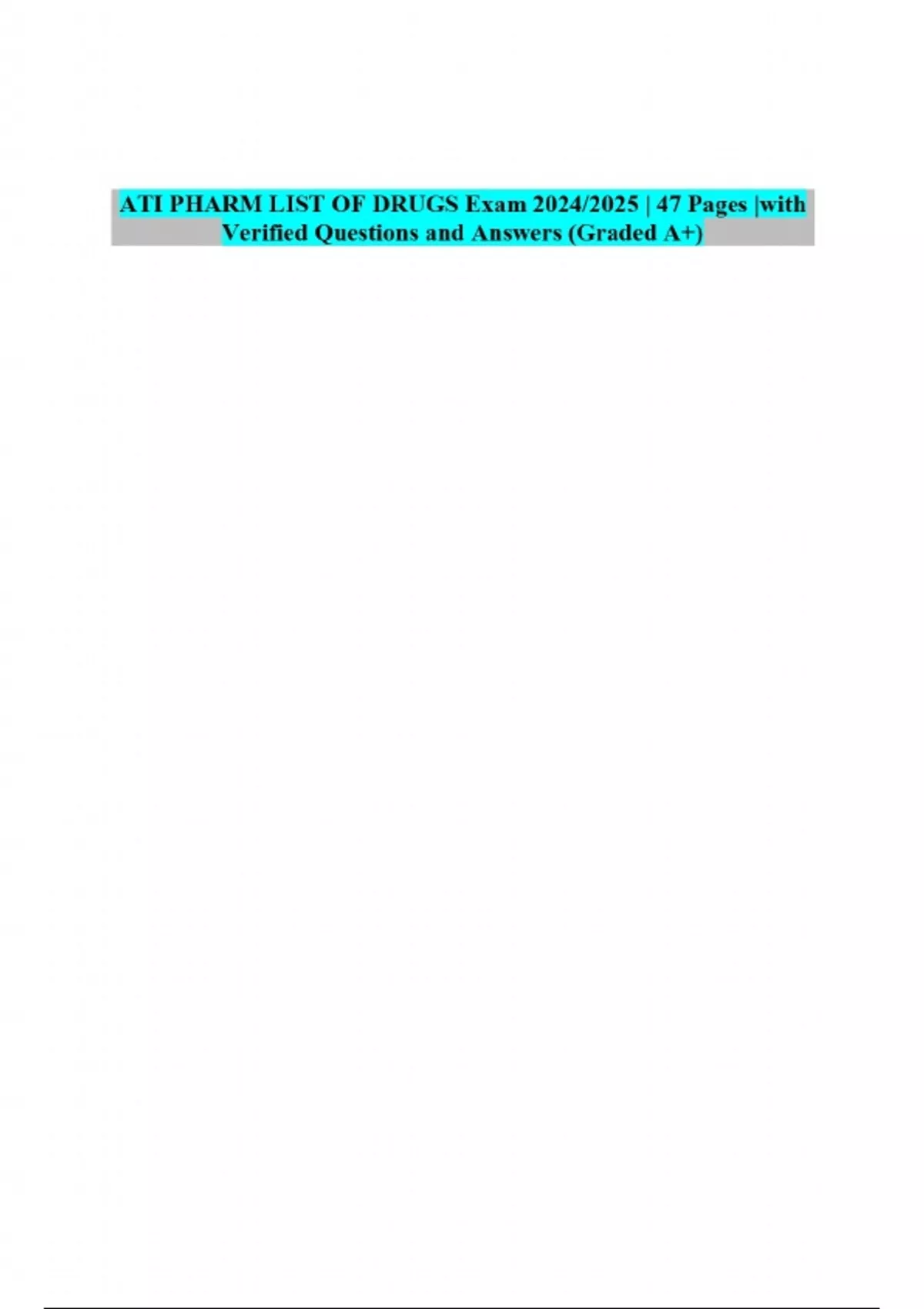 ATI PHARM LIST OF DRUGS Exam 2024/2025 | 47 Pages |with Verified Questions and Answers (Graded A+)