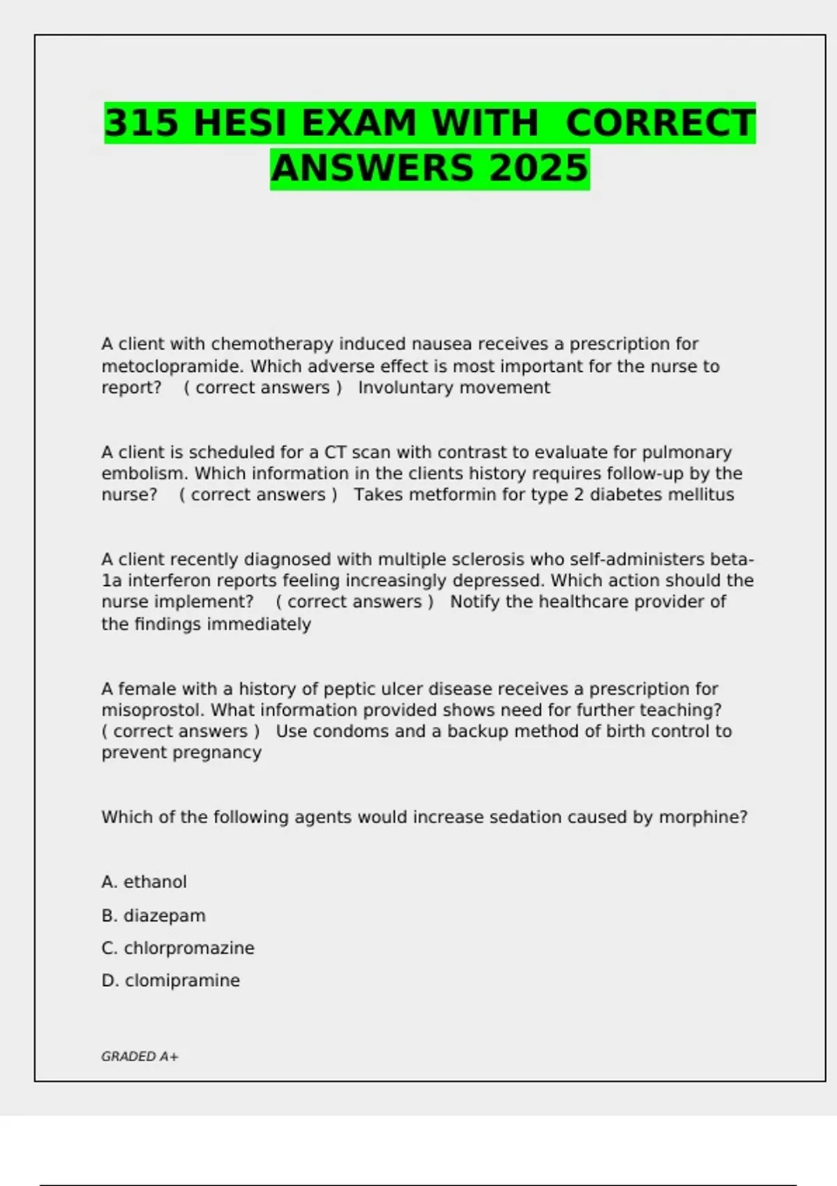 315 HESI EXAM WITH CORRECT