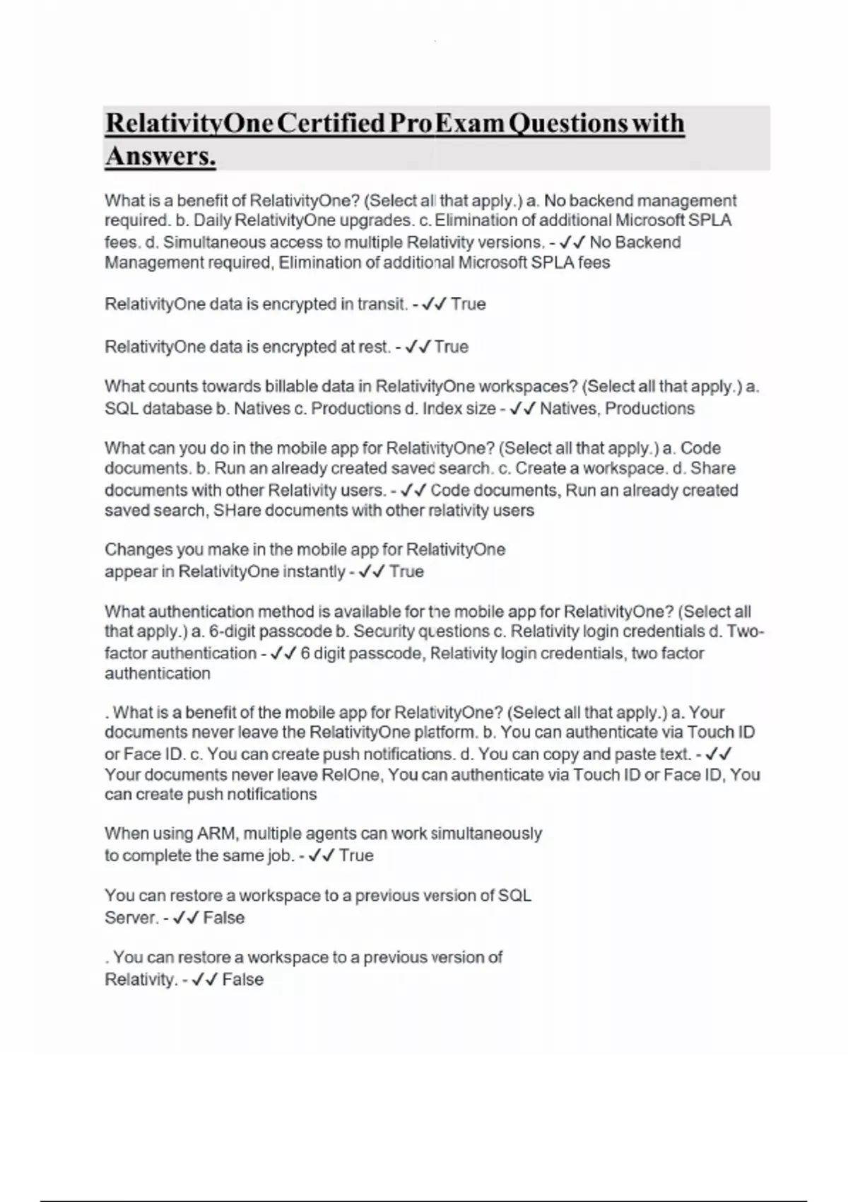 What is a benefit of RelativityOne? (Select all that apply.) a. No backend management required. b. Daily RelativityOne upgrades. c. Elimination of additional Microsoft SPLA fees. d. Simultaneous access to multiple Relativity versions. - No Backend Management required, Elimination of additional Microsoft SPLA fees RelativityOne data is encrypted in transit. - True RelativityOne data is encrypted at rest. - True What counts towards billable data in RelativityOne workspaces? (Select all that apply.) a. SQL database b. Natives c. Productions d. Index size - Natives, Productions What can you do in the mobile app for RelativityOne? (Select all that apply.) a. Code documents