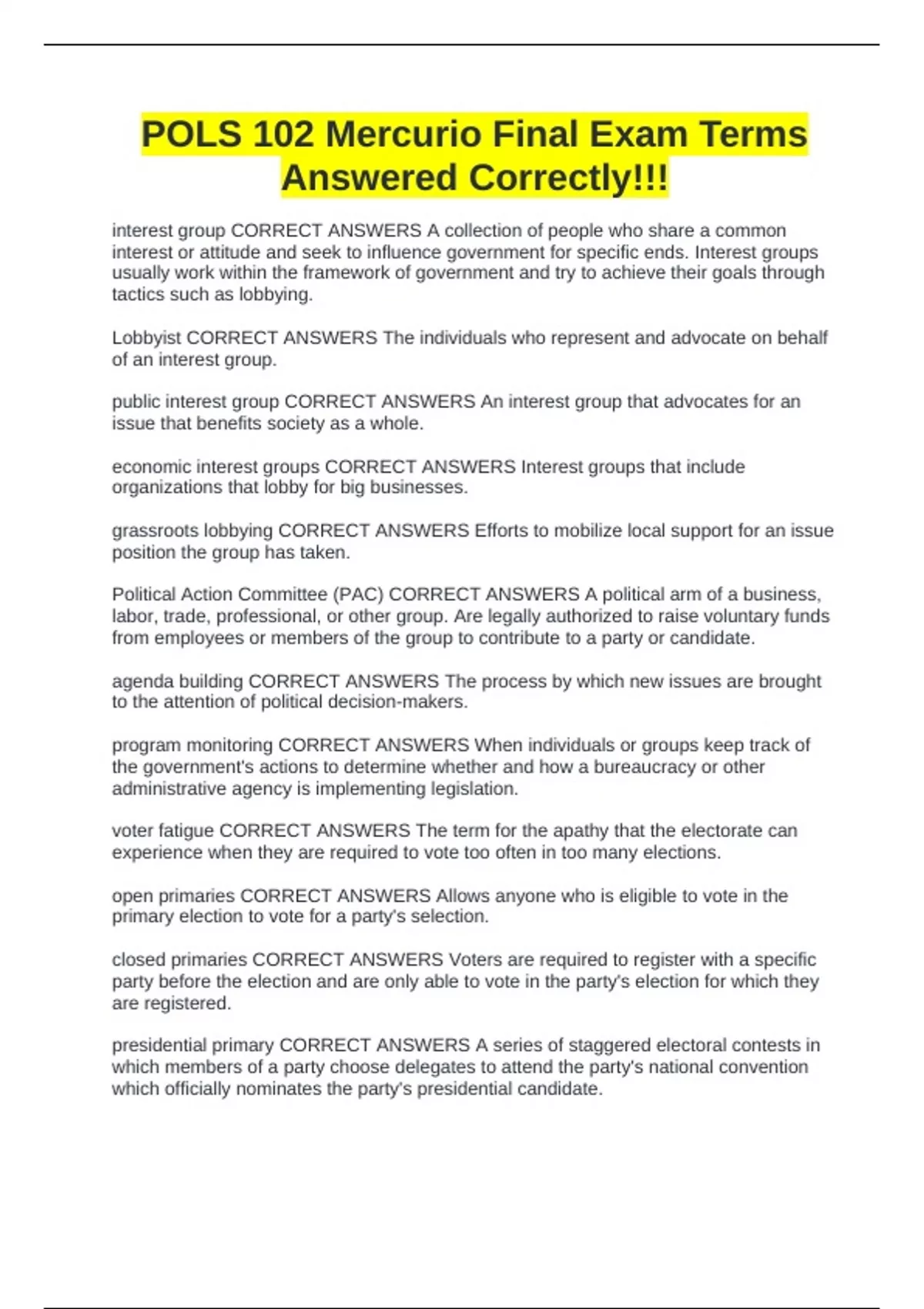 Lobbyist CORRECT ANSWERS The individuals who represent and advocate on behalf