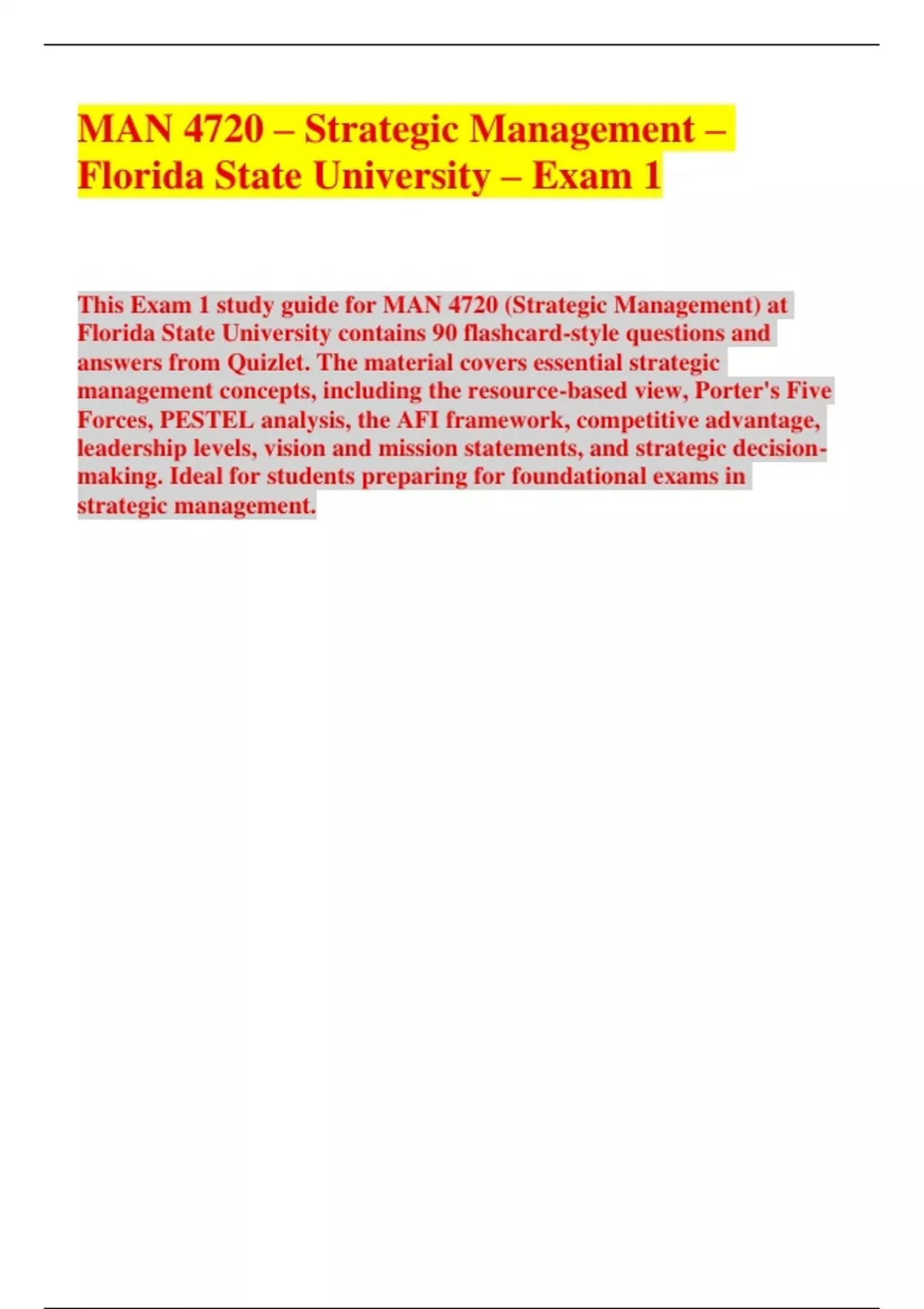 This Exam 1 study guide for MAN 4720 (Strategic Management) at