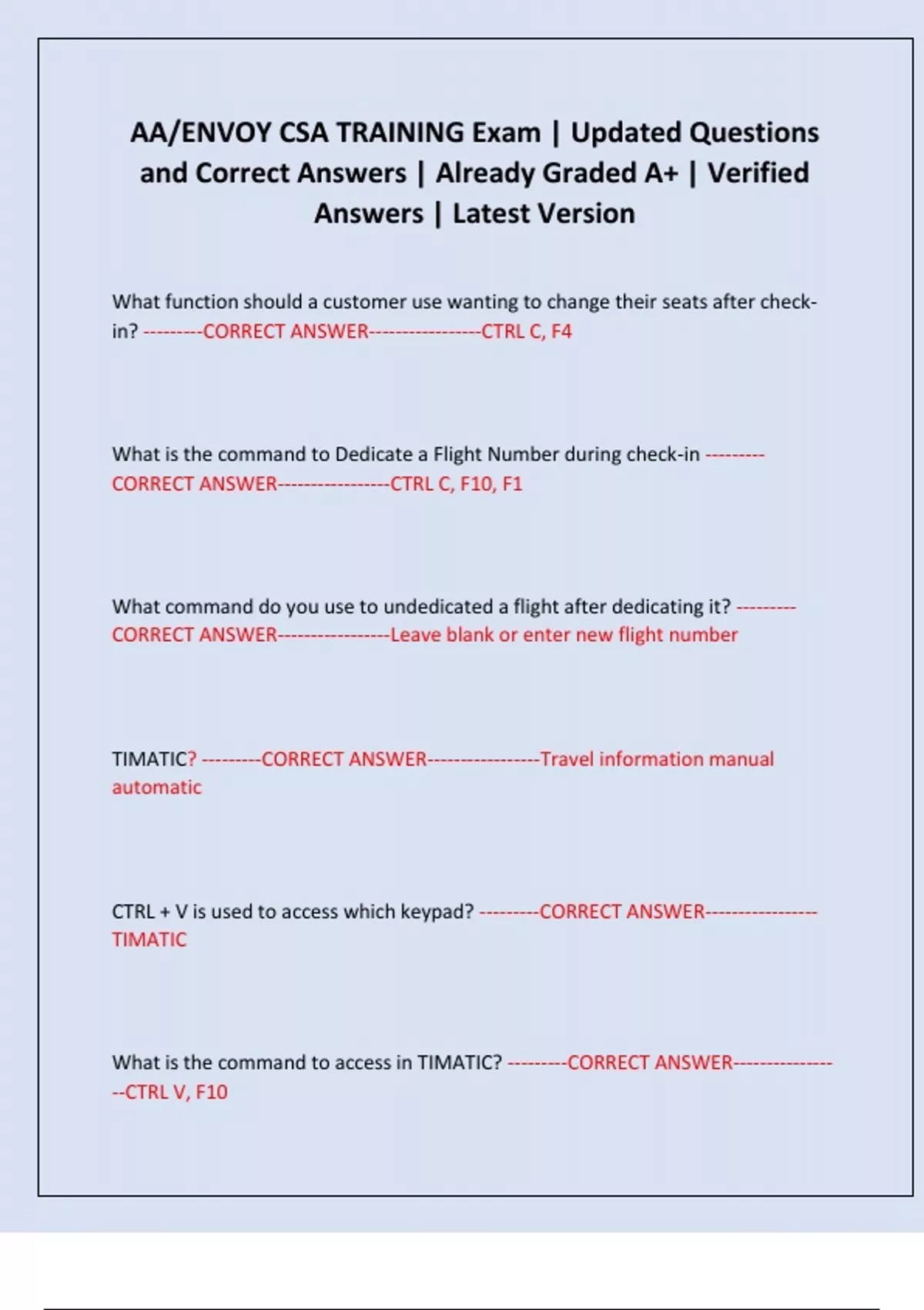 AA/ENVOY CSA TRAINING Exam | Updated Questions and Correct Answers | Already Graded A+ | Verified Answers | Latest Version