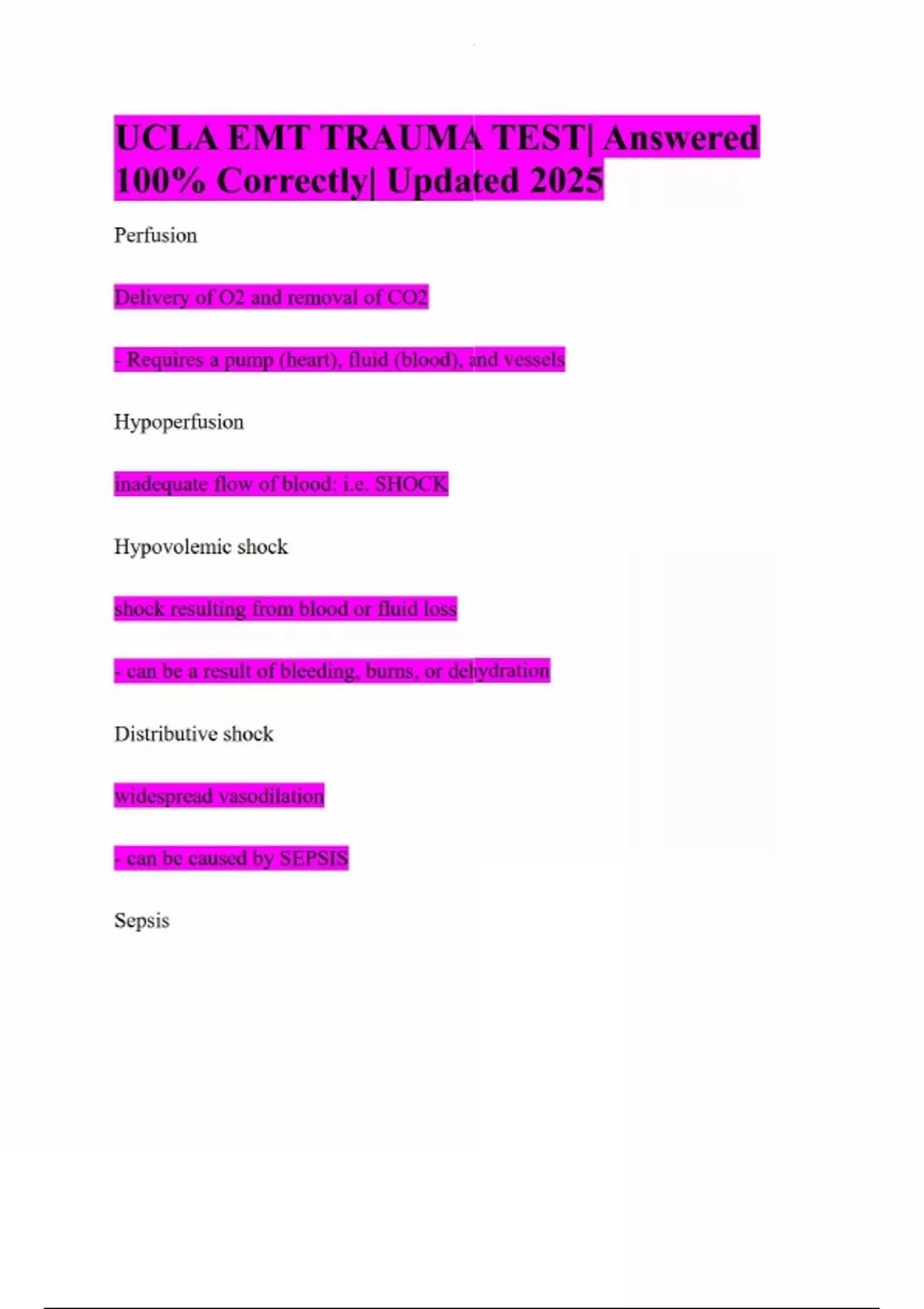 UCLA EMT TRAUMA TEST| Answered 100% Correctly| Updated 2025 Perfusion Delivery of O2 and removal of CO2 - Requires a pump (heart), fluid (blood), and vessels Hypoperfusion inadequate flow of blood: i.e. SHOCK Hypovolemic shock shock resulting from blood or fluid loss - can be a result of bleeding, burns, or dehydration Distributive shock widespread vasodilation - can be caused by SEPSIS Sepsis - Severe infection that has an initial point then spreads throughout bloodstream - Toxins from infection destroy vessel walls, leading to capillary permeability & reduced intravascular fluid How to treat septic shock? POWR: Position (supine), O2, Warmth, Rapid transport Neurogenic shock loss of control of muscular tone of blood vessels (due to a spinal cord injury & damage to the nervous system) Symptoms of neurogenic shock hypotension and bradycardia (only vagus signal bc of sympathetic damage) - usually warm, dry skin below injury (unlike other types of shock) Anaphylactic shock Severe allergic reaction that leads to widespread vasodilation Anaphylactic shock symptoms - Increased vascular permeability - Bronchoconstriction - Stridor - Hives, edema, itching 4 types of skull fractures - linear, depressed, open, basilar Linear skull fracture A simple crack in the skull - least deadly - most common - usually perpendicular to suture in skull Depressed skull fracture Inward indentation of the skull with possible pressure on brain - Usually caused from direct trauma to skull (I.e. baseball bat to head) - Will feel abnormal Open skull fracture